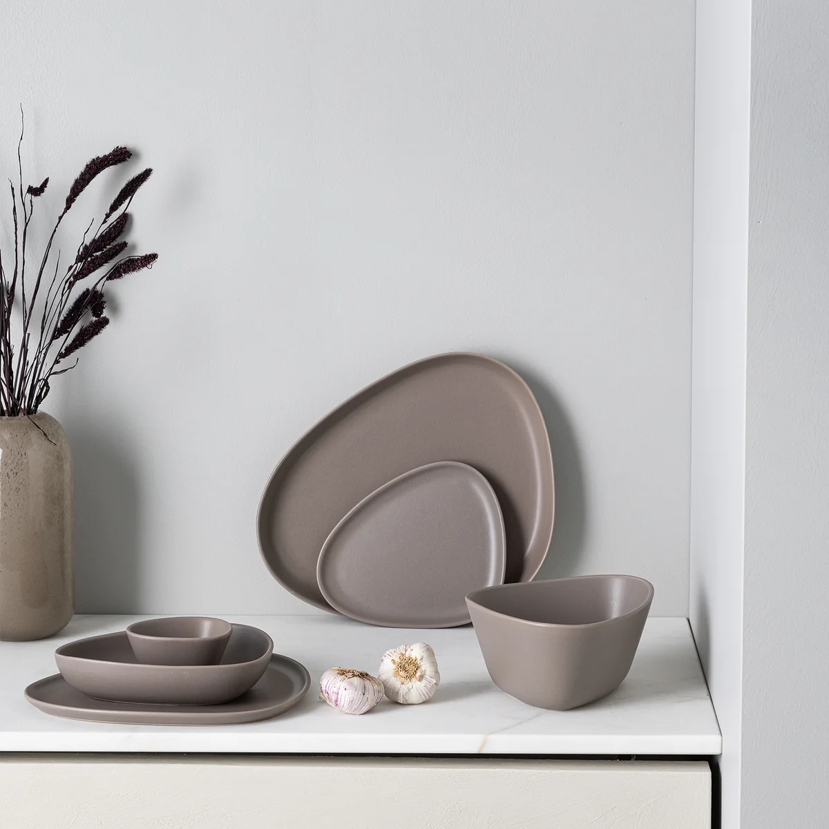 Die Teller sind in verschiedenen Grössen erhältlich und somit für jede Art von Speisen geeignet. Der tiefe Teller eignet sich für Suppen, die flachen Teller für Frühstück, Mittag- und Abendessen gleichermassen und die Platte ist optimal zum Servieren und Anrichten geeignet. Hergestellt werden die Teller aus robustem Steinzeug, wodurch sie einfach in der Spülmaschine gereinigt werden können.