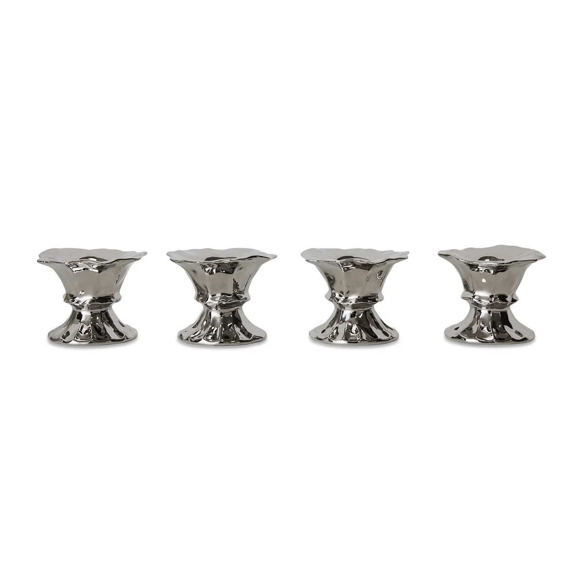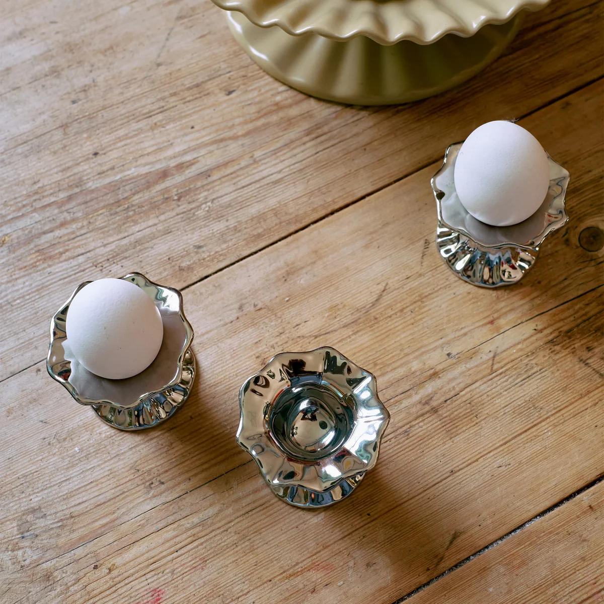 Die New Classics Eierbecher von HKliving bringen mit ihrer minimalistischen Form und der glänzenden Veredelung frischen Glanz auf den Frühstückstisch. Gefertigt aus Keramik und versehen mit einer auffälligen Chromglasur, verbinden sie klassische Funktionalität mit einer modernen, fast futuristischen Optik. Das Viererset ist nicht nur alltagstauglich, sondern setzt auch bei besonderen Gelegenheiten stilvolle Akzente.