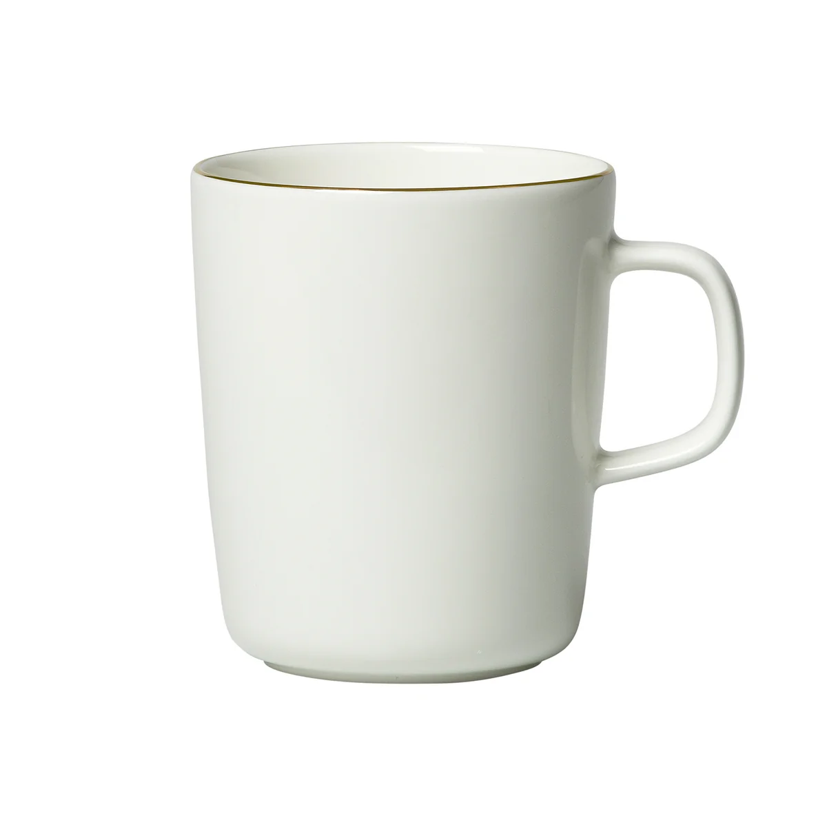 Als Teil der Siirtolapuutarha Kollektion ist der Becher mit Henkel zum 10 jährigen Jubiläum der Oiva Serie nun auch mit einem Goldrand erhältlich. Der Rand ist dezent gestaltet und fügt sich gut in schlichte Wohnräume ein.