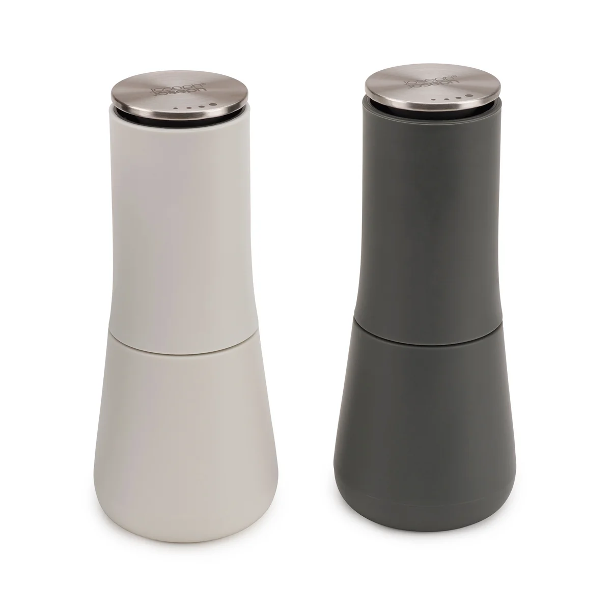 Das Milltop Salz- und Pfeffermühlenset von Joseph Joseph ist innovativ und praktisch. Hinterlassen andere Salz und Pfeffermühlen häufig Reste, wenn sie abgestellt werden, so fällt überschüssig Gemahlenes nach Verwendung zurück in die Milltop Mühlen. Der Trick: Das Mahlwerk befindet sich oben an der Mühle. Das umgekehrte Design verhindert Krümel auf der Arbeitsfläche und dem Esstisch.