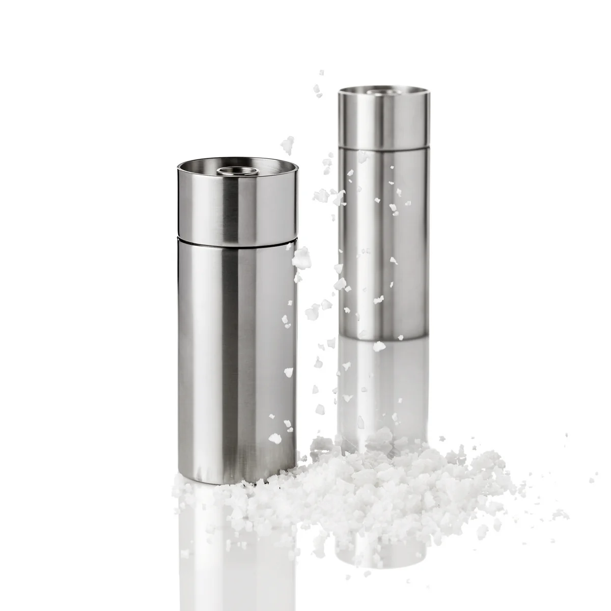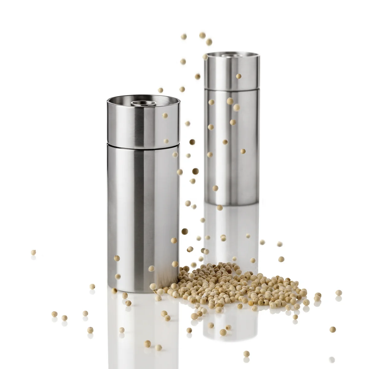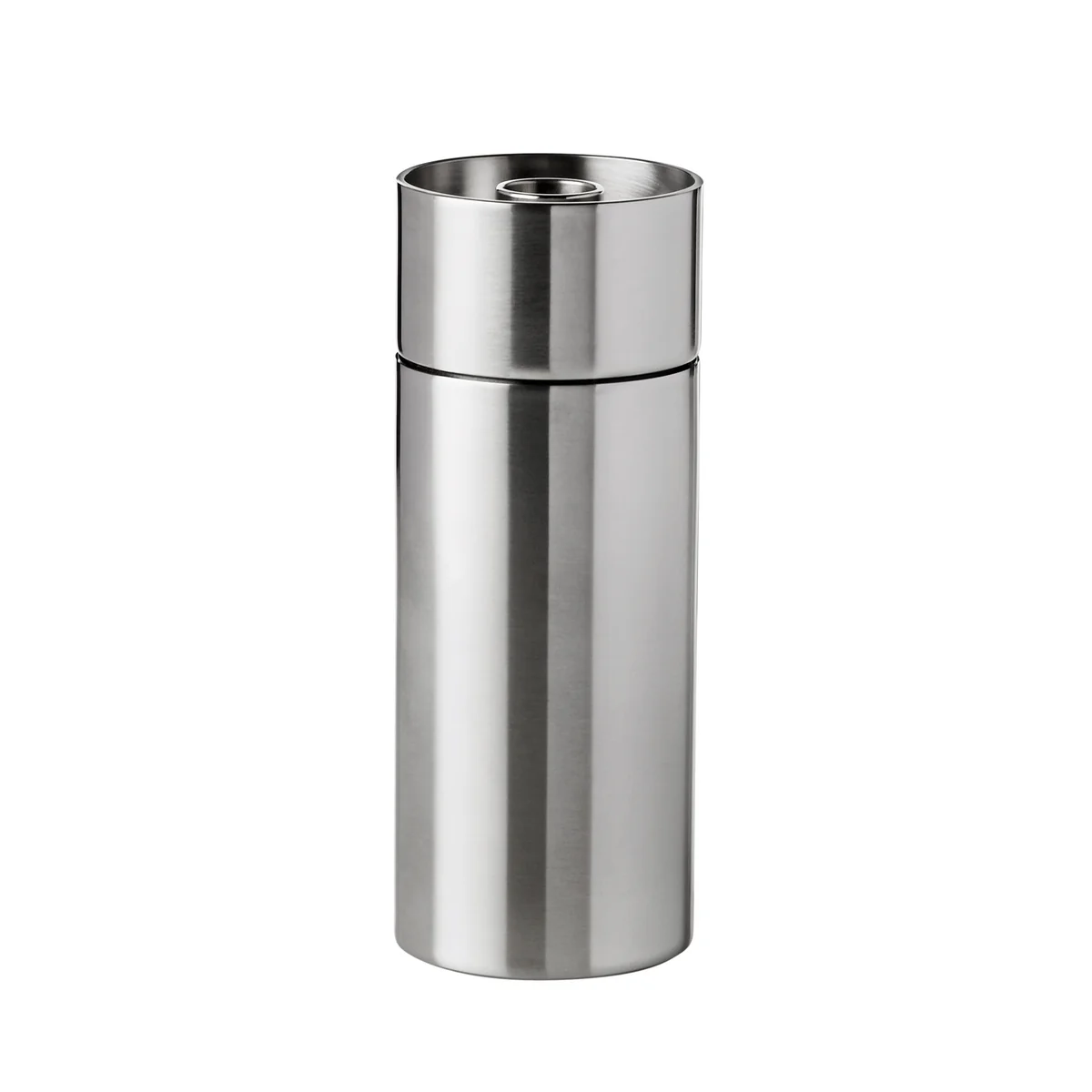 Die Salz- und Pfeffermühlen aus der Cylinda-Serie von Stelton bestehen aus mattpoliertem Edelstahl. Zusammen mit dem keramischen Mahlwerk verspricht das Material eine lange Lebensdauer und viel Freude am Produkt. Die Pfeffermühle ist durch einen schwarzen Punkt auf der Verschluss-Schraube gekennzeichnet, die Salzmühle durch einen weissen.