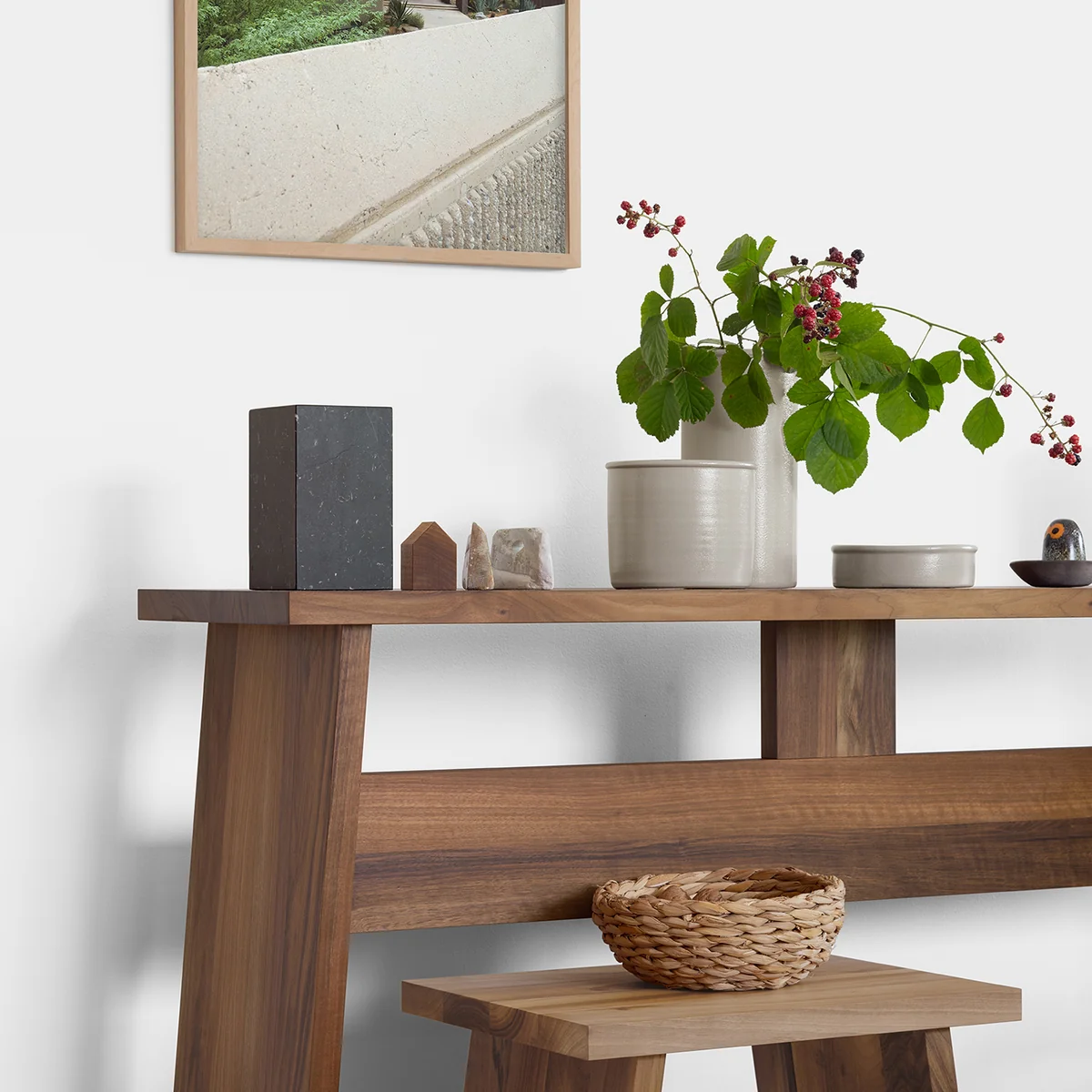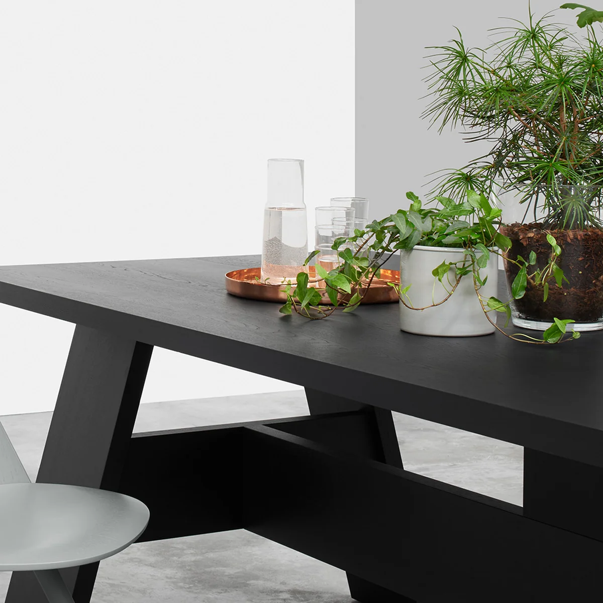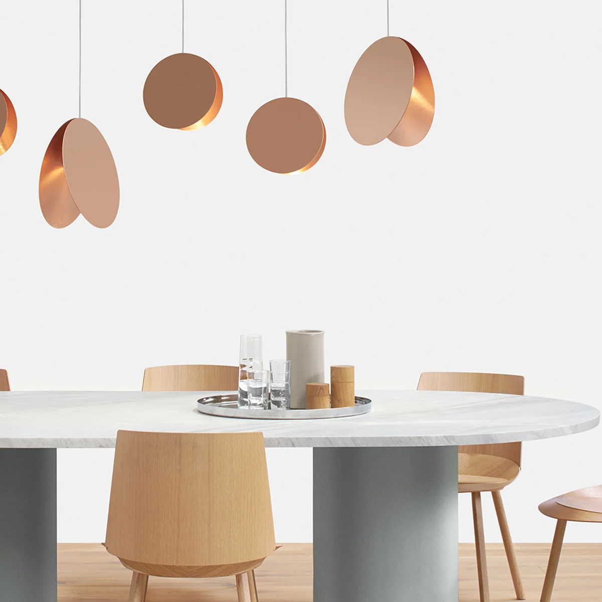 Seine einzigartige Ästhetik erhält das Material durch die Behandlung der Keramik mit Salz, wodurch eine besondere Oberflächenstruktur entsteht. Die zylindrische Form unterstreicht die reduzierte, zeitlose Designsprache und wirkt in Kombination mit der Verwendung natürlicher Materialen traditionell und hochwertig.