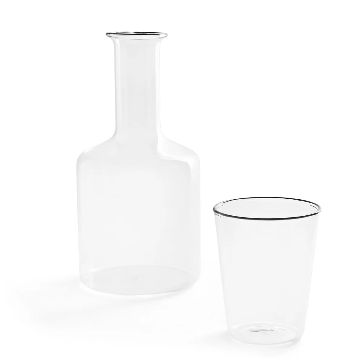 Die Rim Karaffe des dänischen Labels HAY ist mit seinem schlanken Hals und dem kontrastierenden Rand ein überaus dekoratives Gefäss. Es kann wunderbar zum Ausschenken von Wasser, Wein und Co verwendet werden. Die Rim Karaffe wird aus widerstandsfähigem Borosilikatglas gefertigt und kann ideal mit den Rim Trinkgläsern kombiniert werden.