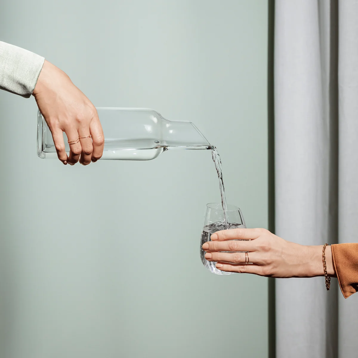 Übrigens passt die Glaskaraffe mit 1l Fassungsvermögen hervorragend in die Kühlschranktür, sodass sich auch gekühlte Getränke daraus geniessen lassen.