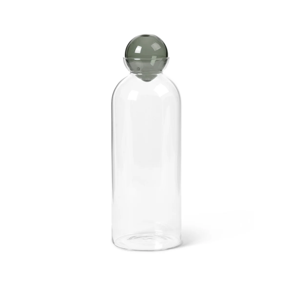 Der kugelförmige gefärbte Glaskorken liegt wie eine Luftblase auf der Öffnung der mundgeblasenen Karaffe, die ein elegantes Serviergefäss für Wasser, Saft oder andere Getränke ist. Sie wurde für den täglichen Gebrauch entwickelt und kann mit den passenden Gläsern zu einem eleganten Glasservice kombiniert werden.