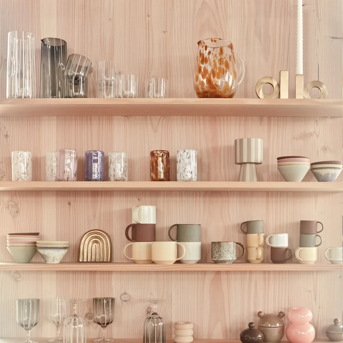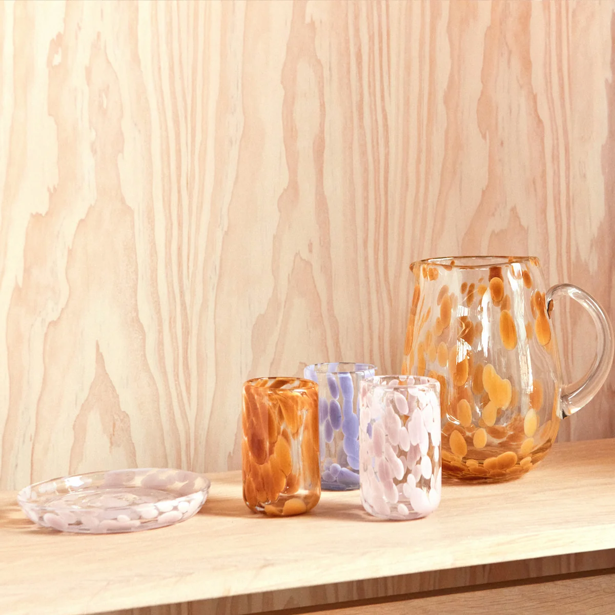 Die Jali-Glaswarenserie präsentiert ein dynamisches, unberechenbares Fleckenmuster, das sich in unterschiedlichen Farbausführungen auf dem Glas bemerkbar macht. Die abgerundeten Kanten formen ein organisches Design, das nicht nur eine angenehme Optik auf dem Esstisch bildet, sondern auch bei Lichteinfall ein wunderschönes Schattenspiel schafft. Die Jali-Kollektion bringt Sommergefühle in die vier Wände und einen festlichen Touch an den Weihnachtstisch.