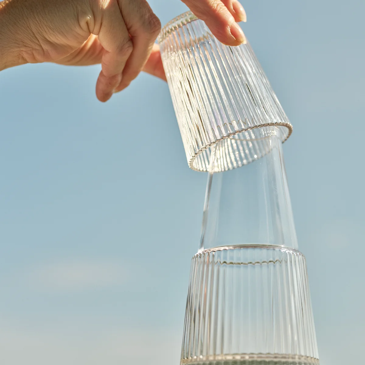 Ein Liter Flüssigkeit fasst die hochwertige Karaffe, bei der ein Glas mit dabei ist. Das Glas dient auch als Deckel der Karaffe. Beides besitzt eine gerillte Oberfläche, die die Haptik verbessert und für eine schöne Lichtbrechung sorgt. Die Karaffe ist ein garantierter Blickfang beim Bewirten von Gästen.