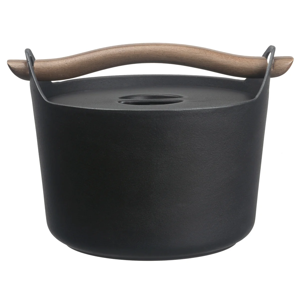 Professor Timo Sarpanevas Grossvater war ein Schmied. Die Tatsache, dass er sich in seiner Kindheit viel in der Nähe von Feuer und geschmolzenem Metall aufhielt, inspirierte den Designer Sarpaneva dazu, seine beliebte Version des Gusseisentopfes zu schaffen. Der Sarpaneva-Topf ist inzwischen so beliebt, dass er auf einer Briefmarkenreihe zu Ehren der finnischen Design-Elite abgebildet wurde. Der Sarpaneva-Topf ist eine Kombination aus Tradition, Funktionalismus und eleganter Ästhetik. Er ist ein Basisobjekt für Ihre Küche, das Sie vom Ofen direkt auf den Tisch bringen können. Zu seinen innovativen Eigenschaften, durch die er sich von anderen Töpfen unterscheidet, gehört ein abnehmbarer Holzgriff, den Sie benutzen können, um den Deckel abzunehmen und den Topf zu tragen. Die hervorragenden Nutzungseigenschaften dieses emaillierten Topfes auf dem Herd, im Ofen und beim Servieren machen aus diesem Meisterwerk den vielleicht schönsten Gusseisentopf der Welt.