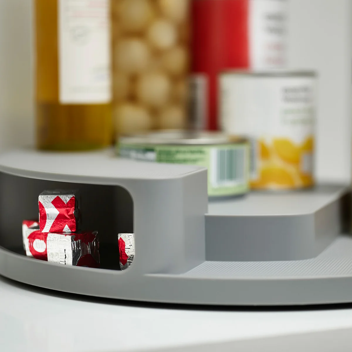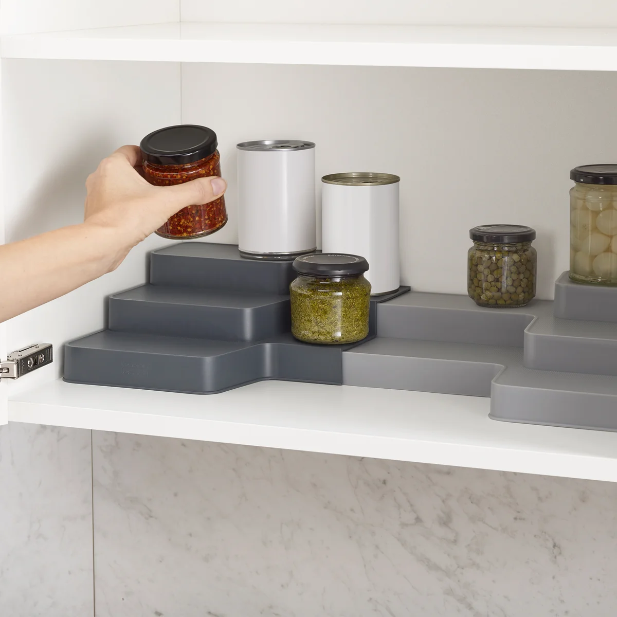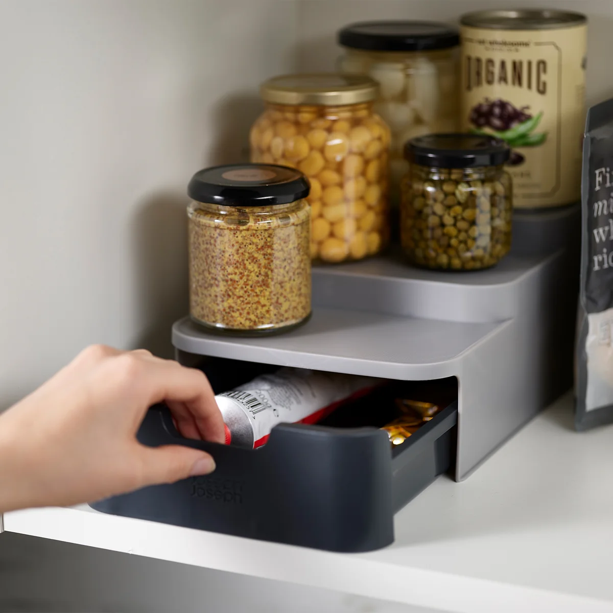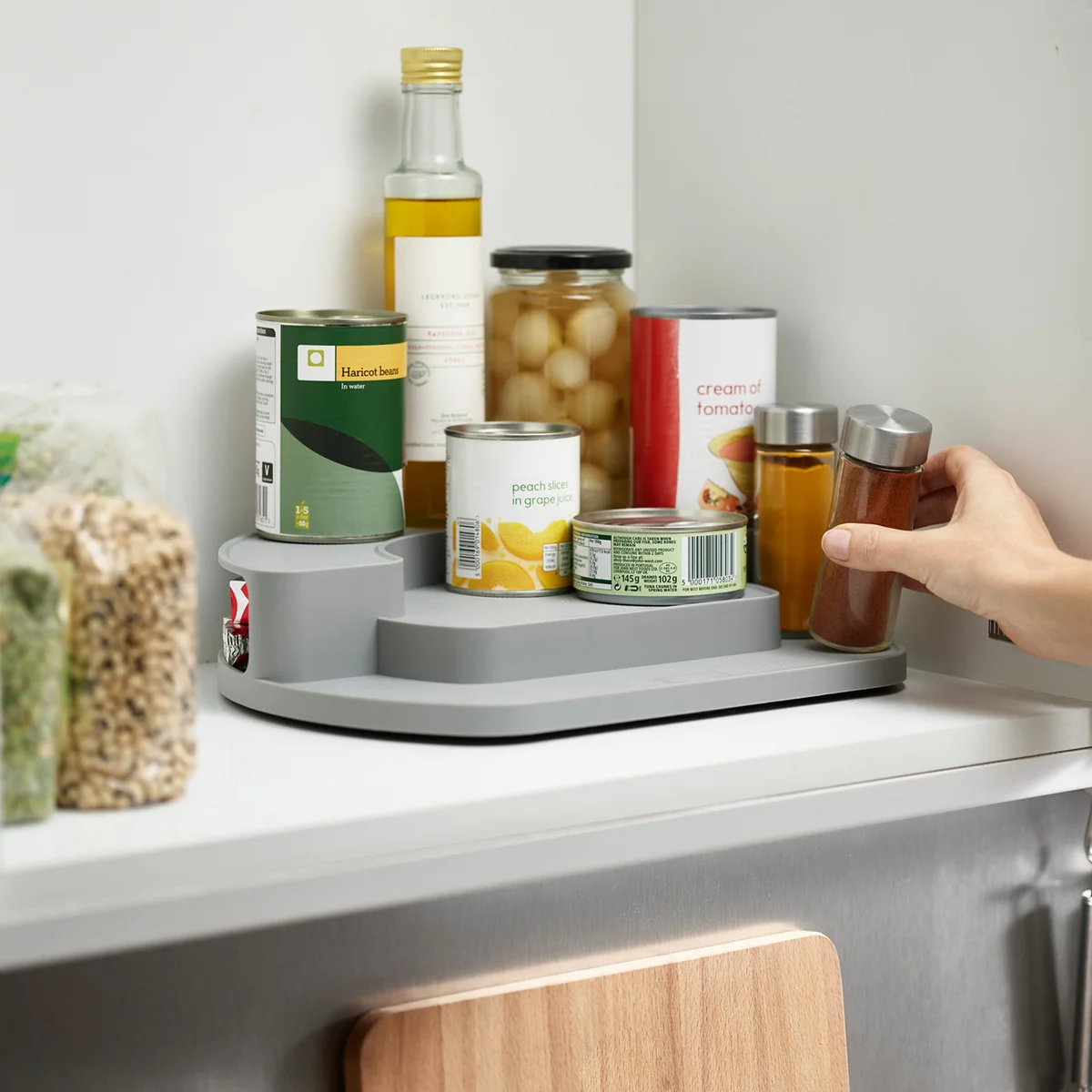 Die Organizer-Treppe ist eine praktische Organisationslösung auf verschiedenen Ebenen. Auf den Treppchen, die sich der Schrankbreite anpassen, werden Konservendosen, Marmeladengläser und Co. auf den verschiedenen Ebenen gut sichtbar platziert und sind leichter greifbar. Die Organizer-Treppe ist ausserdem mit Schubladen erhältlich, in denen Gewürzpackungen und ähnliches einen schönen Platz finden. So wird der Platz im Schrank noch besser genutzt. Auch ist die Treppe als zweistufige, drehbare Version erhältlich.