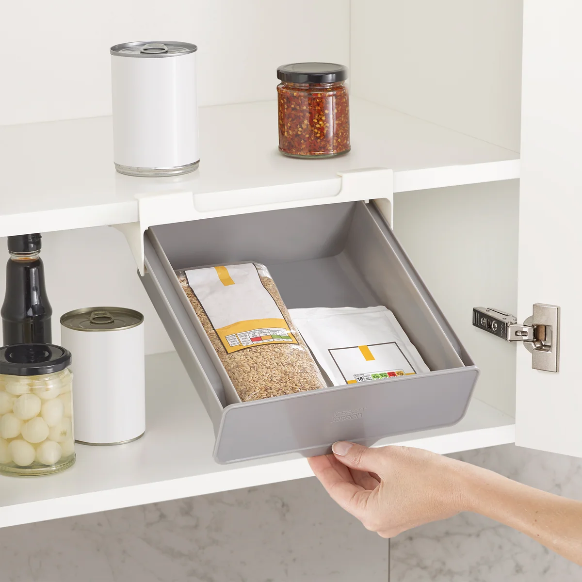 Um auch die Fläche unterhalb der Regalböden zu nutzen, gehören zu der CupboardStore Serie ein Gewürzregal und eine Schublade. Die Vorrichtungen werden ohne Werkzeug sondern mittels starkem, markierungsfreiem 3M-VHBKlebeband angebracht und eignen sich für Küchenschränke ab einer Breite von 40 cm. In dem Gewürzregal finden bis zu 7 übliche Gewürzgläser einen Platz und die Schublade eignet sich perfekt zum Aufbewahren von kleinen Gegenständen, Päckchen oder Beuteln.