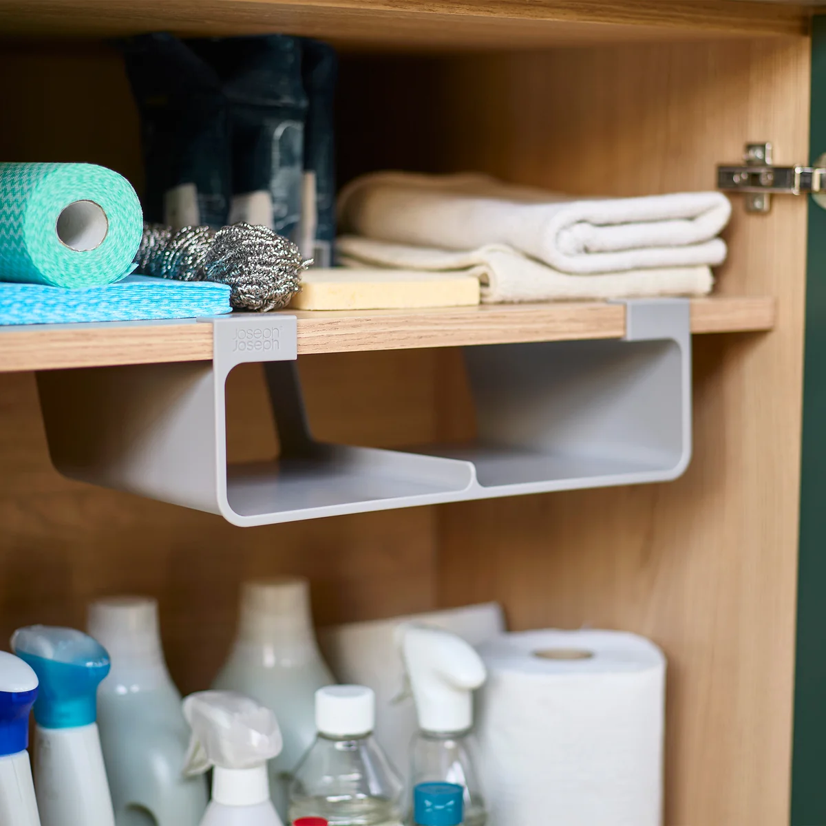 Der Organizer verfügt über zwei offene Fächer zur Lagerung von Rollen oder Kartons mit Frischhaltefolie, Backfolie, Backpapier oder Müllbeuteln. Mittels starken Klebebandes lässt er sich einfach installieren. Die Einheit passt bequem unter ein vorhandenes Regal.