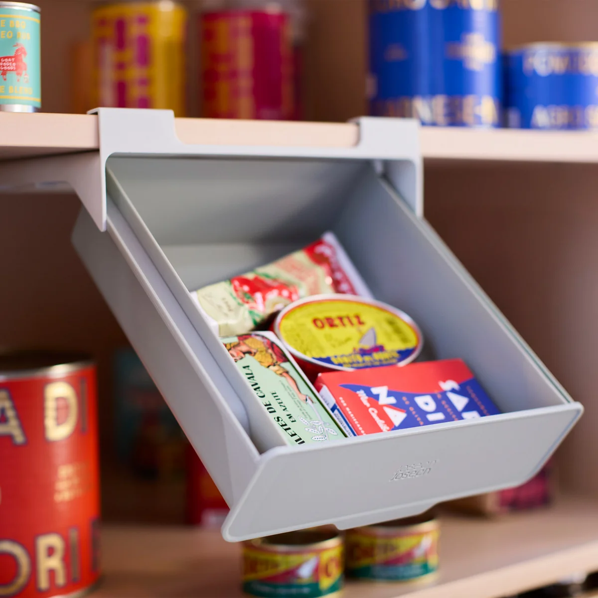 Um auch die Fläche unterhalb der Regalböden zu nutzen, gehören zu der CupboardStore Serie ein Gewürzregal und eine Schublade. Die Vorrichtungen werden ohne Werkzeug sondern mittels starkem, markierungsfreiem 3M-VHBKlebeband angebracht und eignen sich für Küchenschränke ab einer Breite von 40 cm. In dem Gewürzregal finden bis zu 7 übliche Gewürzgläser einen Platz und die Schublade eignet sich perfekt zum Aufbewahren von kleinen Gegenständen, Päckchen oder Beuteln.