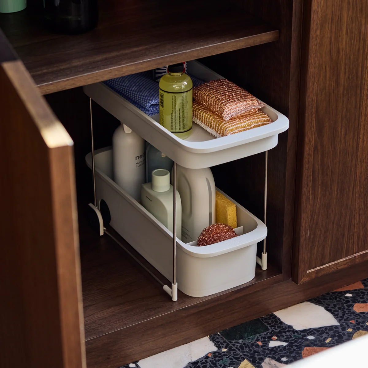 Dieser Caddy vereinfacht die Aufbewahrung von Reinigungsmitteln enorm. Er verfügt über grosse, offene Fächer, die sich ideal für die Aufbewahrung verschiedenster Putzmittelflaschen und Sprays eignen, sowie über ein kompaktes Frontfach für Schwämme und Tücher. Dank der leichtgängigen Räder in der Basis und einer grossen Frontlippe lässt sich der Caddy leicht nach vorne ziehen und bietet so ungehinderten Zugriff auf den Inhalt.