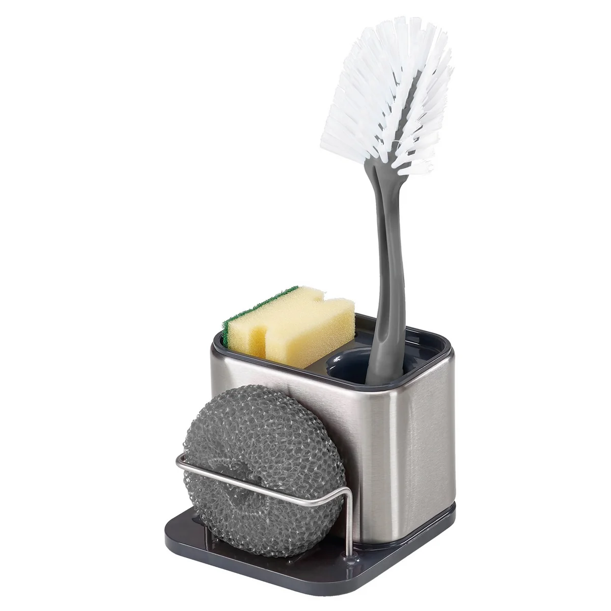 Der Organizer ist in zwei Bereiche unterteilt. Im hinteren Bereich finden die Spülbürste und das Spülmittel einen Platz in der Aufbewahrungsschale, davor haben Schwämme und der Scheuerlappen ihren Platz. Der gerippte und leicht schräge Boden sammelt eventuelles Wasser, welches über eine Öffnung abgelassen werden kann. Der Spül-Organizer ist in zwei verschiedenen Grössen erhältlich.