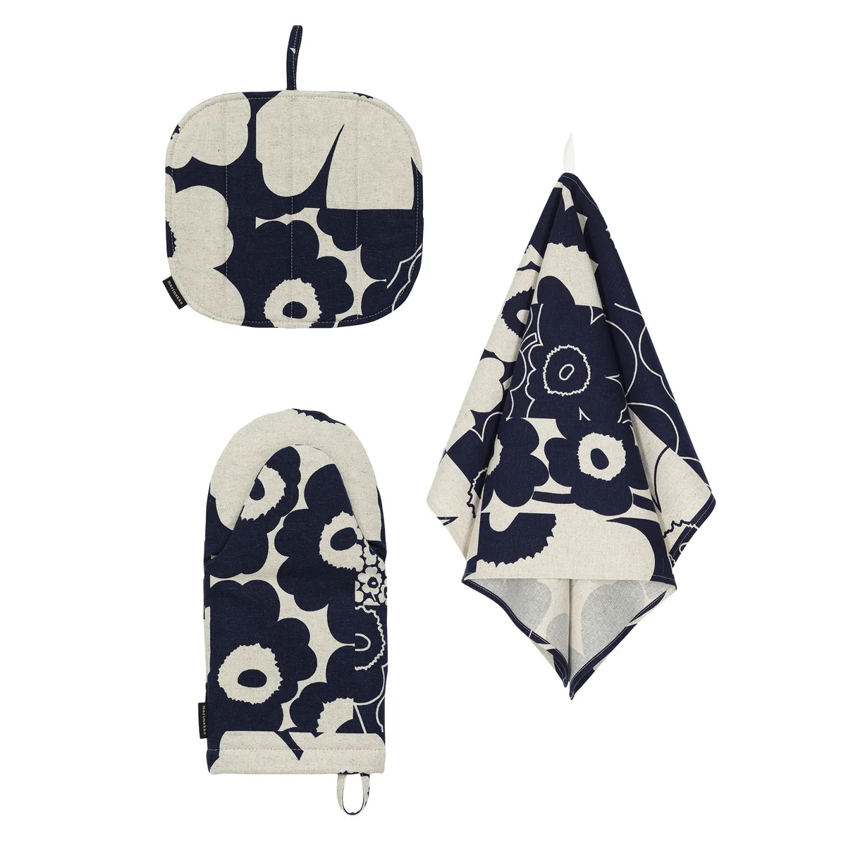 Marimekko - Unikko Kollaasi Küchenset, Geschirrtuch & Ofenhandschuh & Topflappen, linen / dark navy (3er-Set) (60th Anniversary Collection)