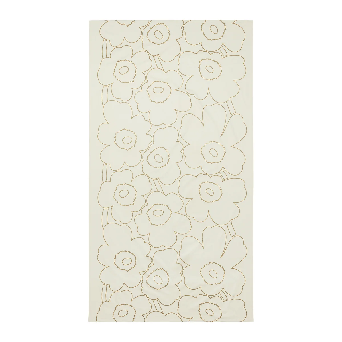 Diese Piirto Unikko Tischdecke aus ungebleichtem Baumwollsatin von Marimekko zeigt das strahlende Piirto Unikko-Muster, das in Helsinki sorgfältig mit Metallpigmenten gedruckt wurde. Die Ränder der Tischdecke sind elegant abgesteppt.