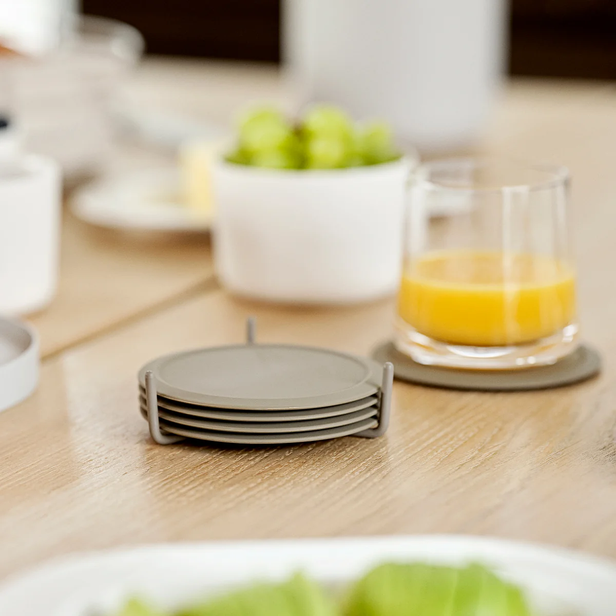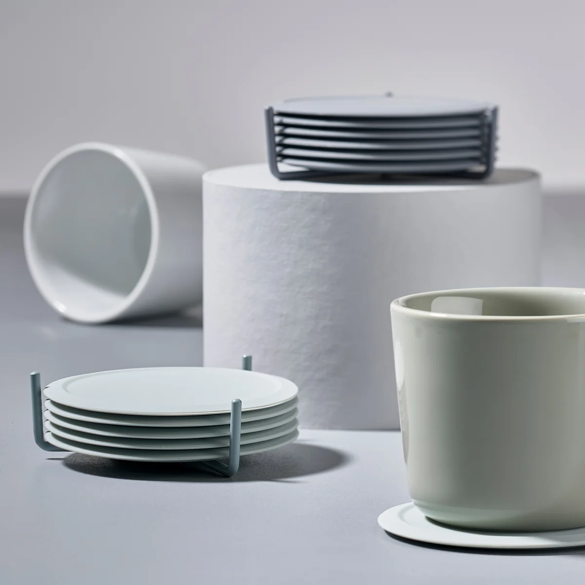 Dank der zugehörigen Basis aus Metall können die von VE2 entworfenen Glasuntersetzer gesammelt und nach der Nutzung platzsparend verstaut werden. Erhältlich sind die Glasuntersetzer in verschiedenen Farben, die sich auch untereinander bestens kombinieren lassen und wunderbar zur Peili Serie von Zone Denmark passen.