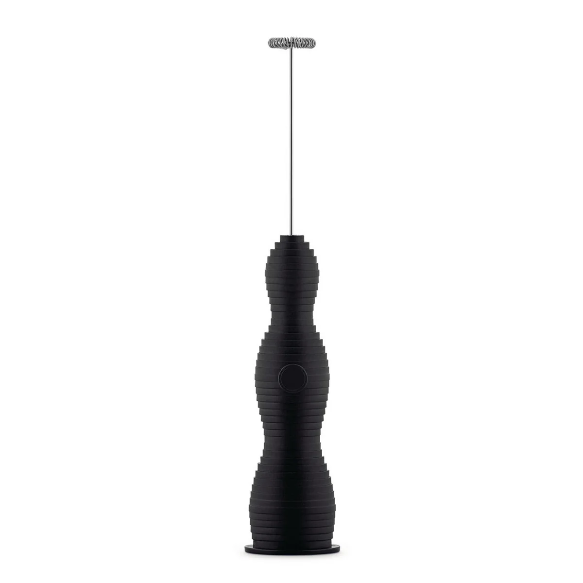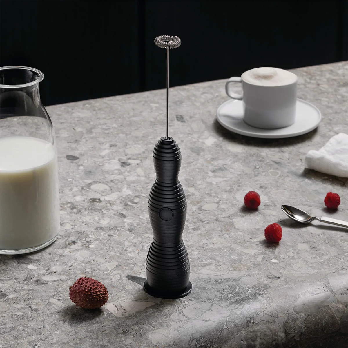 Der Pulcina Milchaufschäumer von Alessi überzeugt durch ein geometrisches Design mit leichten Wölbungen, die ihm eine gewisse Handlichkeit und Funktionalität verleihen.