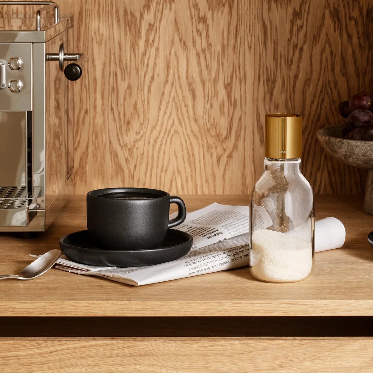 Der Zuckerspender des dänischen Herstellers Eva Solo ist ein hygienische und äusserst moderne Variante der klassischen Zuckerdose. Der kleine, elegante Spender liegt bequem in der Hand. Ganz einfach den Kopf des Zuckerspenders drehen und einen Teelöffel zum Portionieren wählen oder direkt zum Streuen verwenden. Er lässt sich problemlos in der Spülmaschine reinigen. Gefertigt aus Glas und Edelstahl.