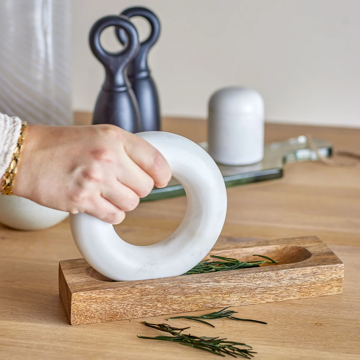 Der Manuella Mörser & Stössel kombiniert Funktionalität mit stilvollem Design. Der runde Mörser in Weiss harmoniert perfekt mit dem dunklen Mangoholz des kleinen Halters und schafft eine natürliche, elegante Optik. Ideal zum Zerstossen von Gewürzen und Kräutern – ein praktisches und dekoratives Element, das jede Küche bereichert.