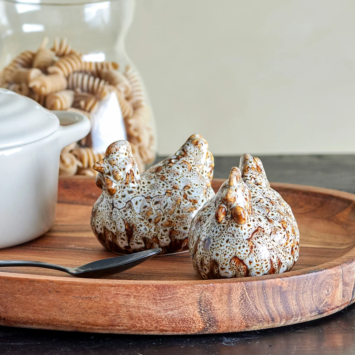 Die Chicky Salz & Pfefferstreuer von Bloomingville sorgen für eine gemütliche Atmosphäre am Tisch. Die Streuer verfügen über die Form von Hühnern und sind aus ästhetischem Steingut geformt. Sie präsentieren sich in einer schönen bunten Glasur in harmonischen Farben. Aufgrund der Beschaffenheit der Glasur kann es zu Abweichungen in Mustern und Schattierungen kommen.