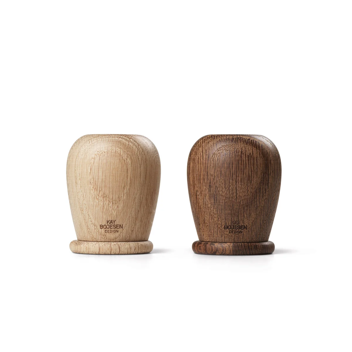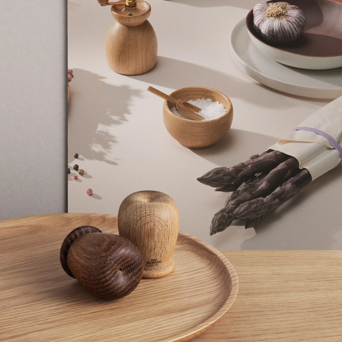 Die Salz- und Pfefferstreuer von Kay Bojesen überzeugen durch die kompakte Form und die natürlichen Eigenschaften. Die Streuer werden aus gedrechseltem Eichenholz hergestellt und sind dank der Maserung des Holzes besonders dekorativ.