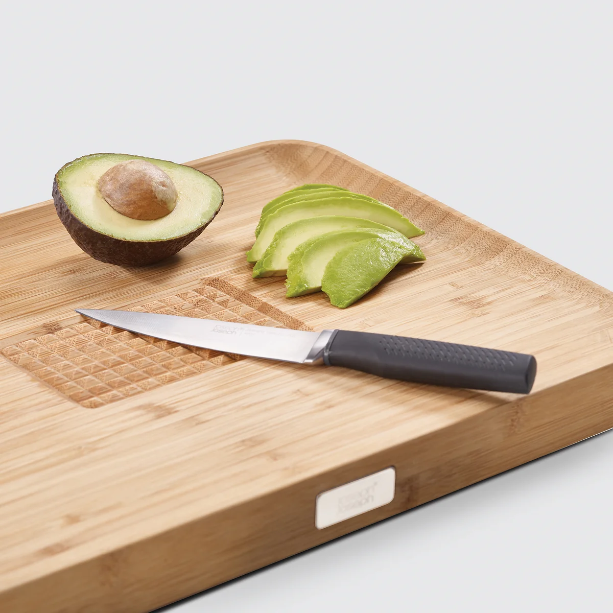 Das Cut & Carve Bamboo von Joseph Joseph ist ein schweres und robustes Schneidebrett aus Bambus, welches sich optimal zum Vorbereiten und Verarbeiten von Fleisch, Brot und Gemüse eignet. Für ein sicheres Schneiden sorgt dabei das Areal in der Mitte des Brettes, welches zur Fixierung der Lebensmittel dient und verhindert, dass diese verrutschen.