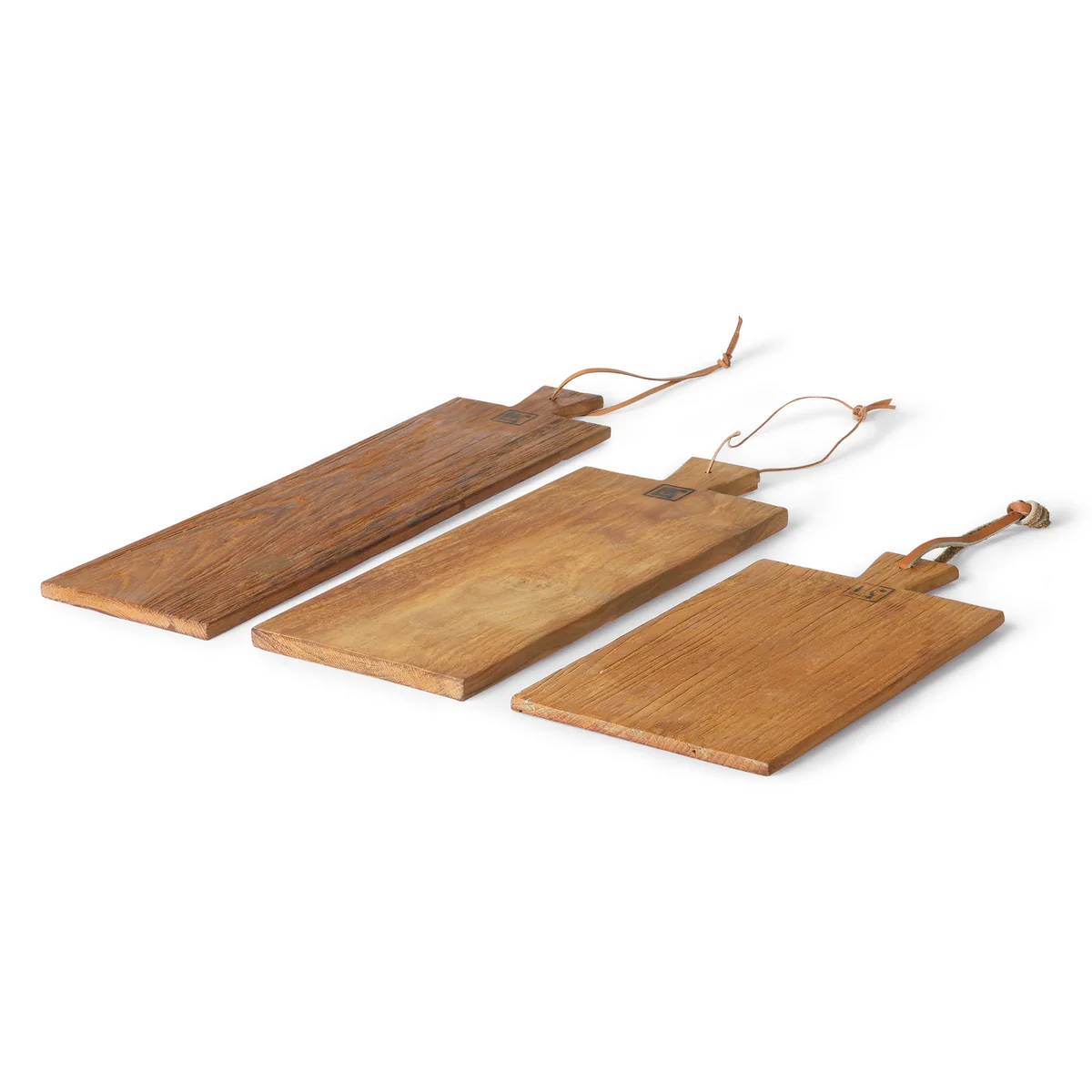 Das Set wird aus Teakholz hergestellt und besteht aus drei verschieden grossen Servierbrettern mit einem praktischen Lederband zum Aufhängen.