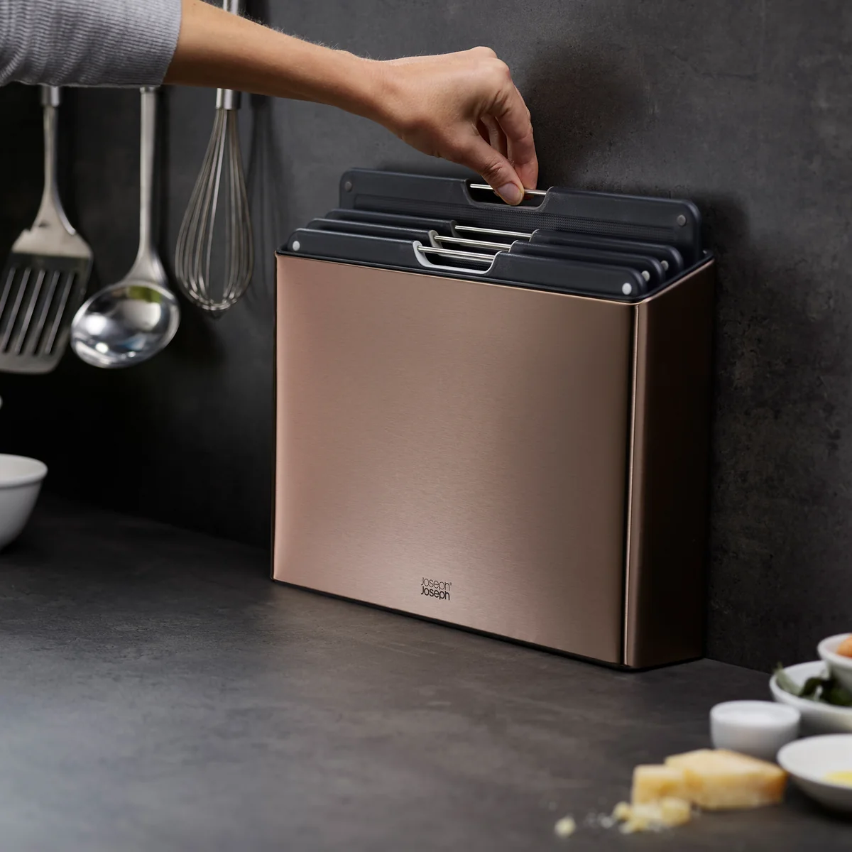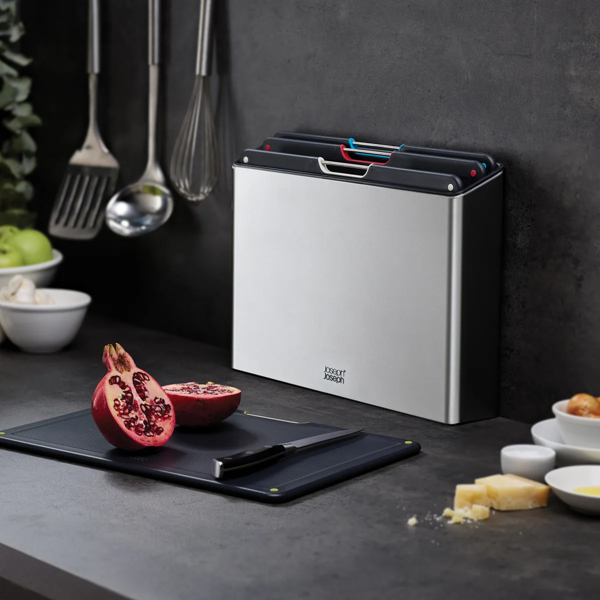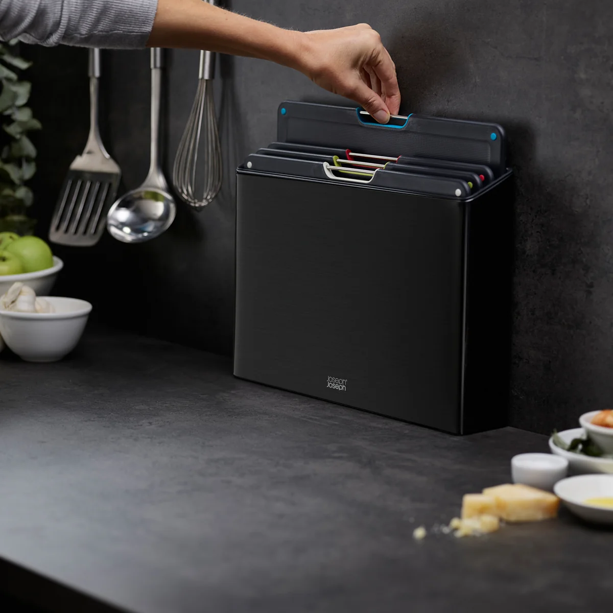 Die Folio Steel Schneidebretter von Joseph Joseph helfen dabei Ordnung in der Küche zu halten. Vier unterschiedlich farbige Schneidebretter werden in einem schmalen Edelstahl-Gehäuse aufbewahrt und können durch einen Griff einfach entnommen werden.