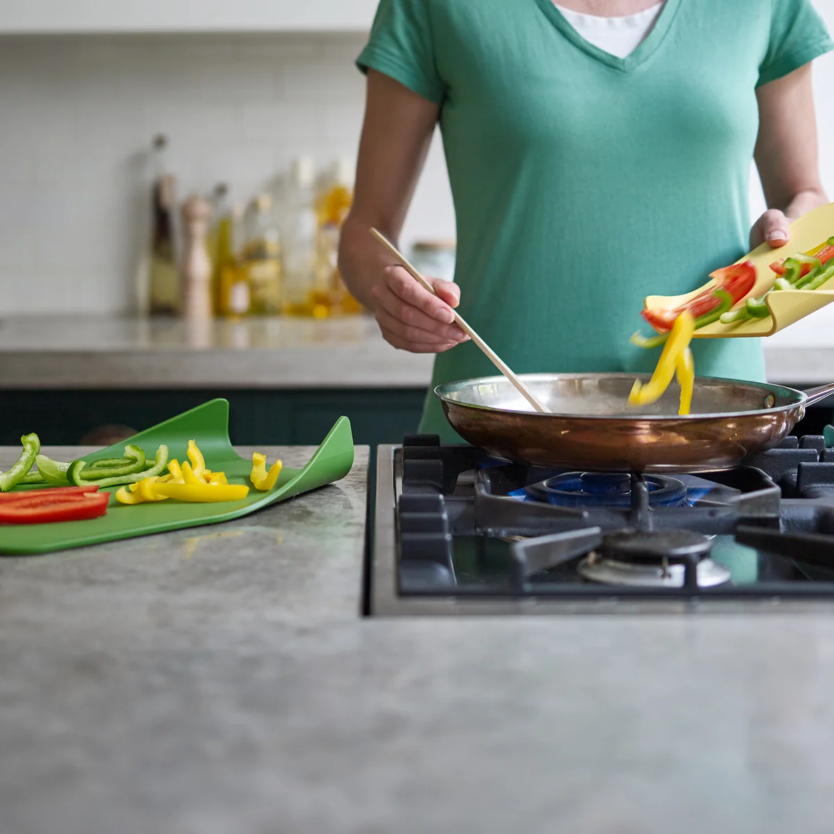 Das Set besteht aus drei unterschiedlich grossen Schneidebrettern, deren Enden es ihnen erlaubt aufrecht stehen zu können und gleichzeitig die zerkleinerten Lebensmittel sicher in den Topf befördern. Jedes Board verfügt über eine strukturierte, messerfreundliche Oberfläche und eine rutschfeste Unterseite.