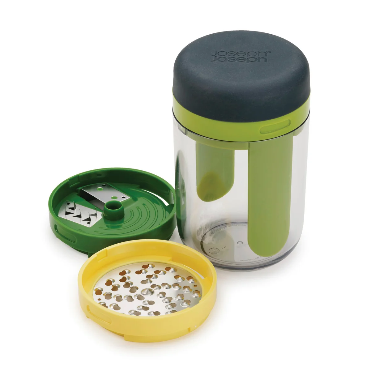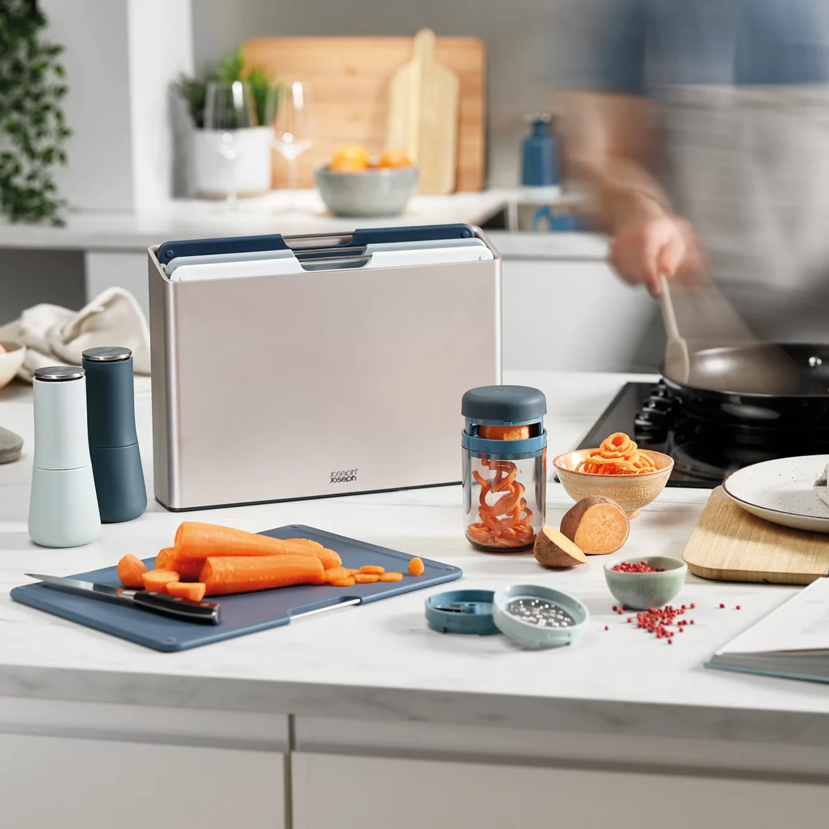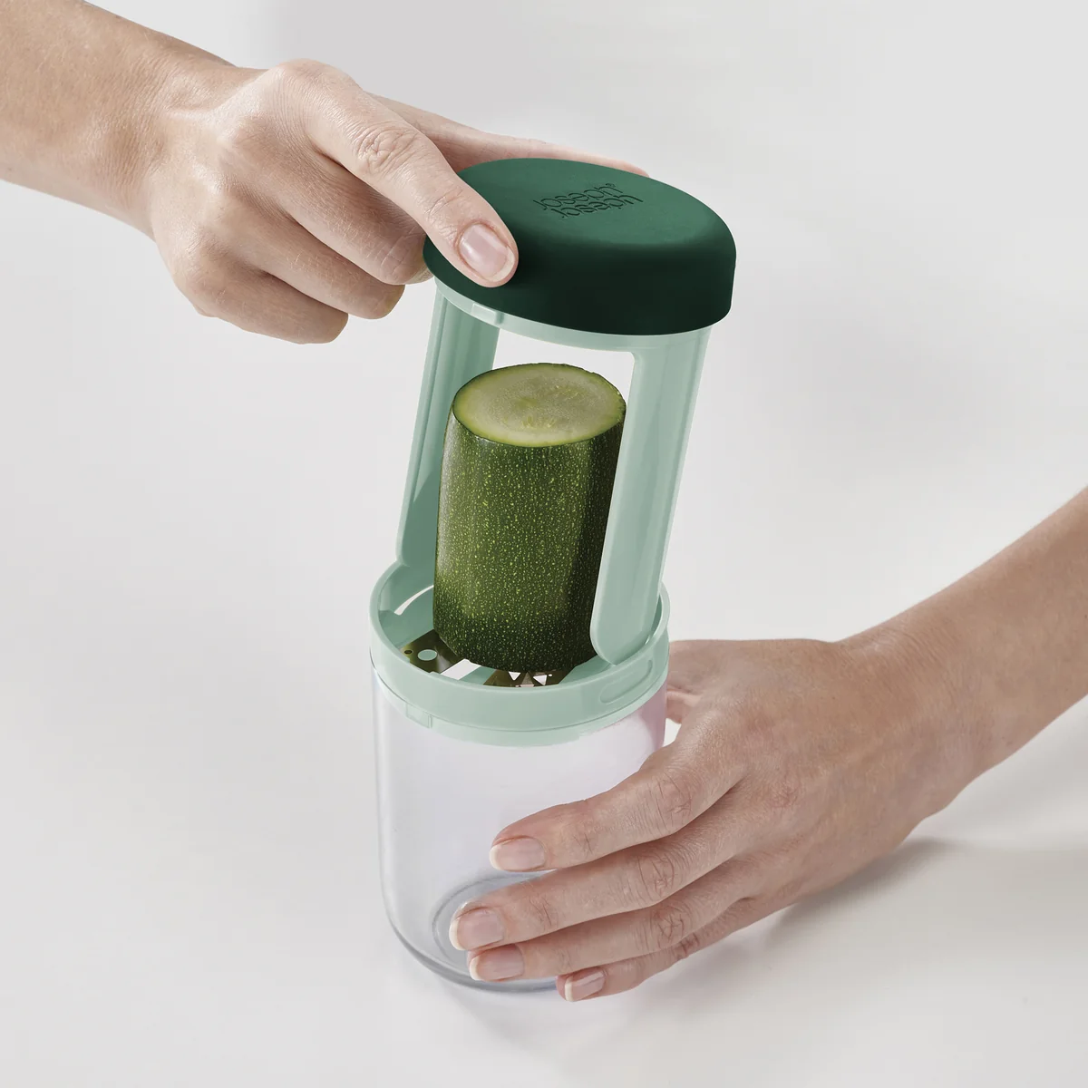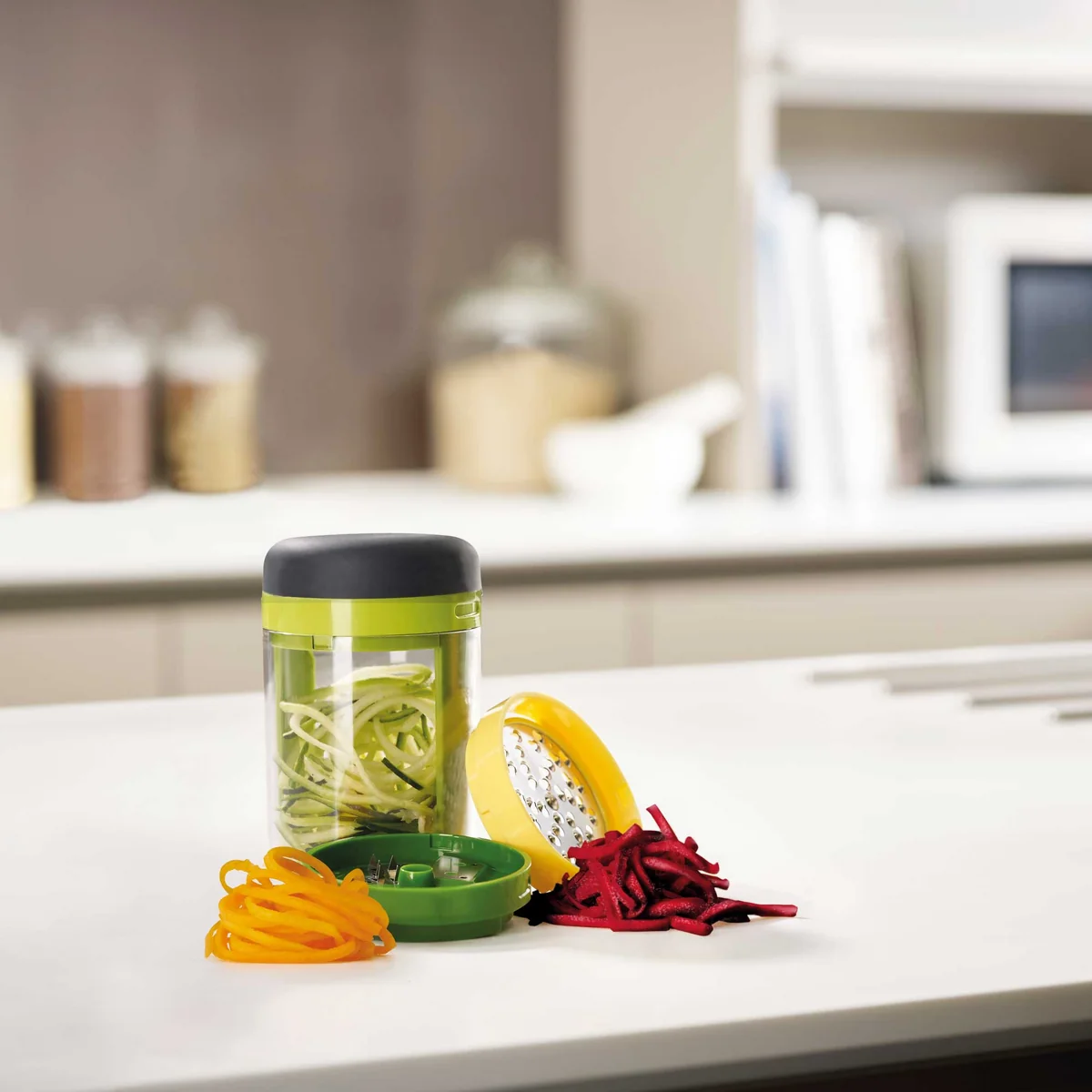 Der Spiro Spiralschneider von Joseph Joseph ist ein 3-in-1 Schneider, mit dem das Zerkleinern von Lebensmitteln dank seiner ergonomischen Drehfunktion leicht von der Hand geht. Das durchdachte Design macht das Schneiden und Reiben zu einer einfachen und sauberen Sache.