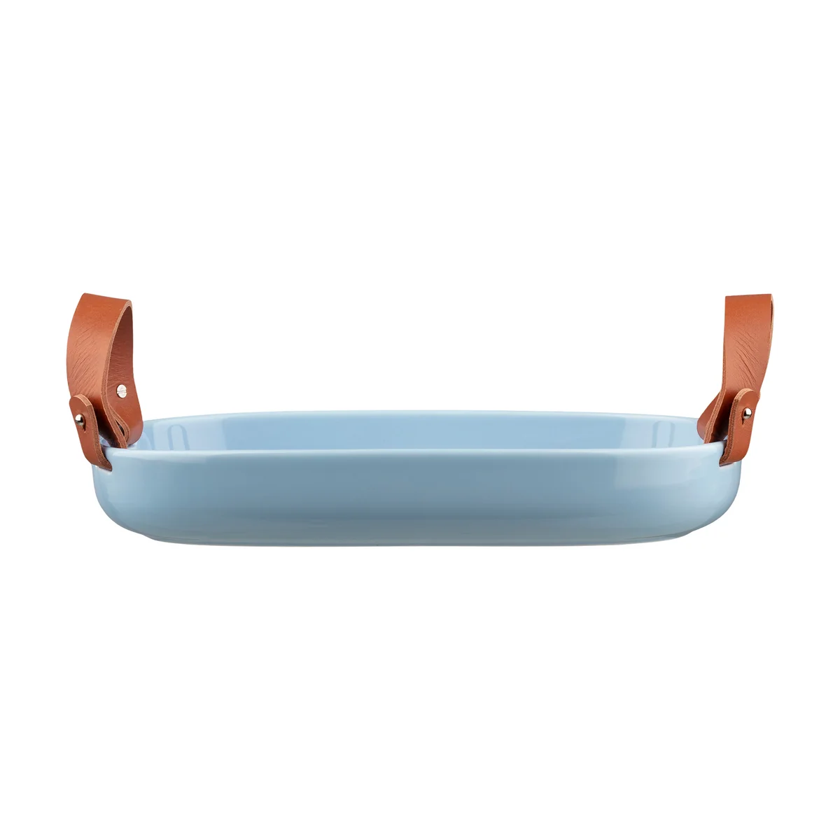 Die Iso Koppa Servierschale besteht aus Keramik mit einer hellblauen Glasur und verfügt über abnehmbare Ledergriffe, die vor dem Waschen entfernt werden sollten. Ideal für stilvolles Servieren, vereint sie Funktionalität und elegantes Design.