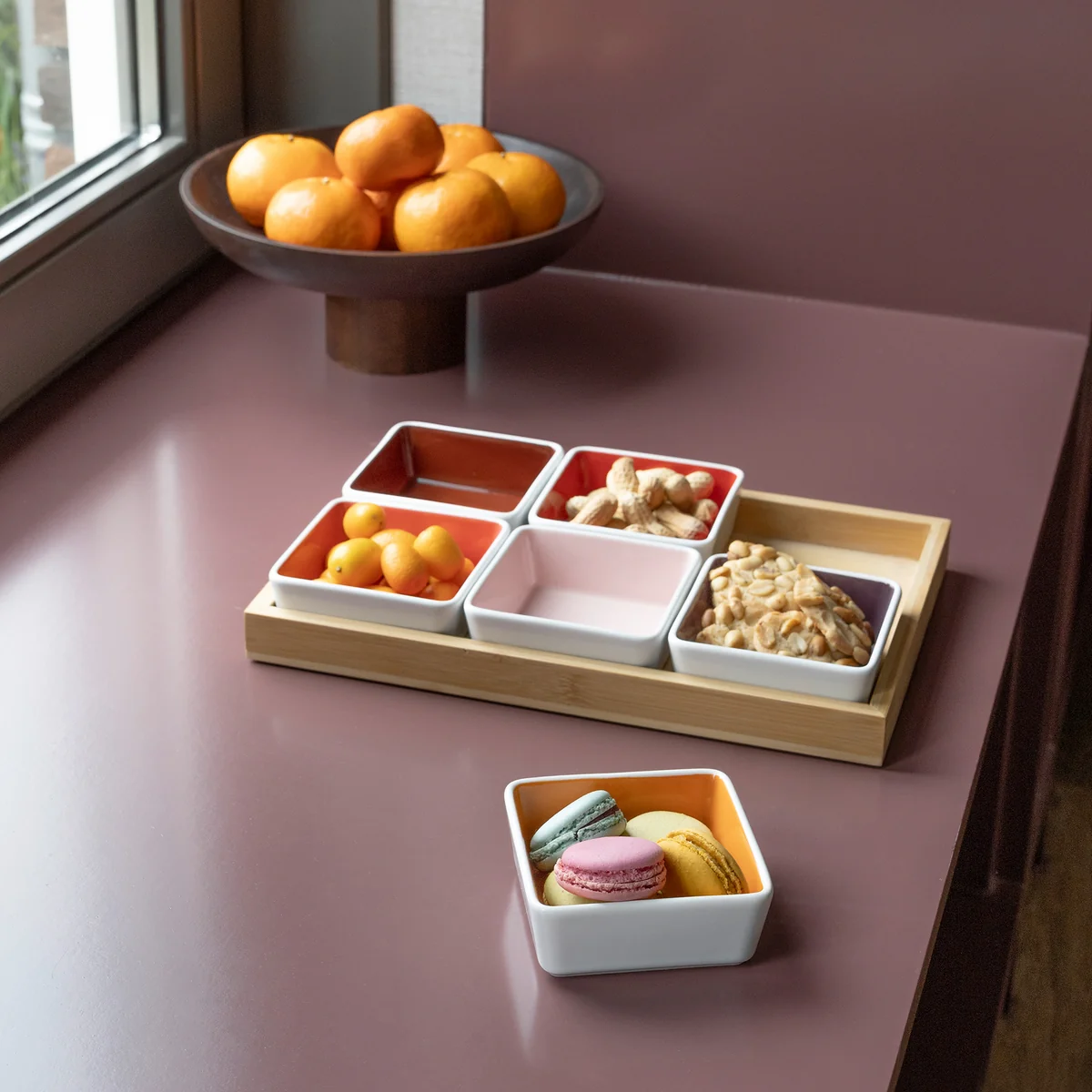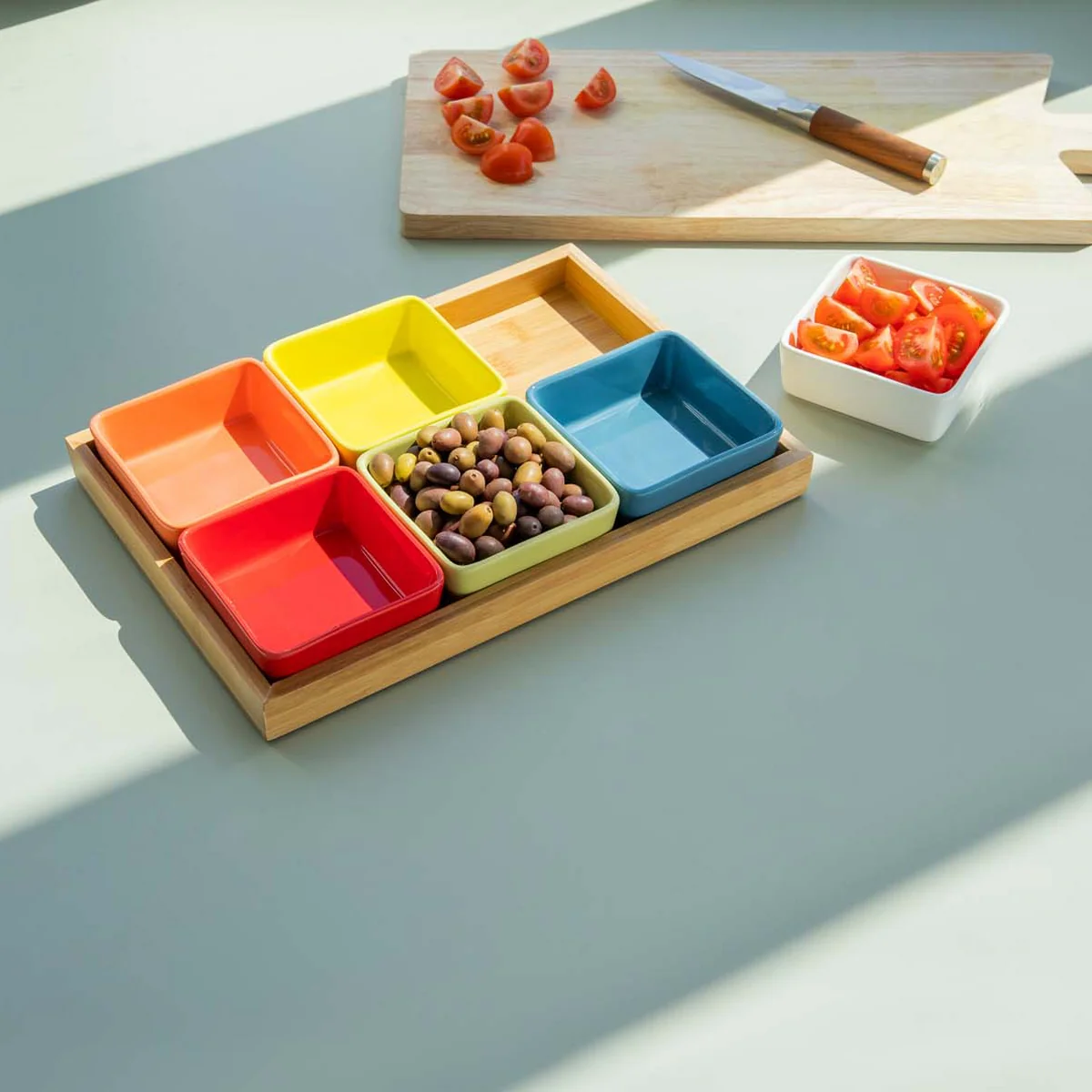 Für schälchenweise Abwechslung in bunten Farben sorgt dieses Schalenset mit Holztablett. Für Cracker und Nüsse zum Aperitif, Tapas am Abend, Saucen beim Barbecue oder Knabberzeug für zwischendurch. Die Schalen lassen sich im Geschirrspüler reinigen.
