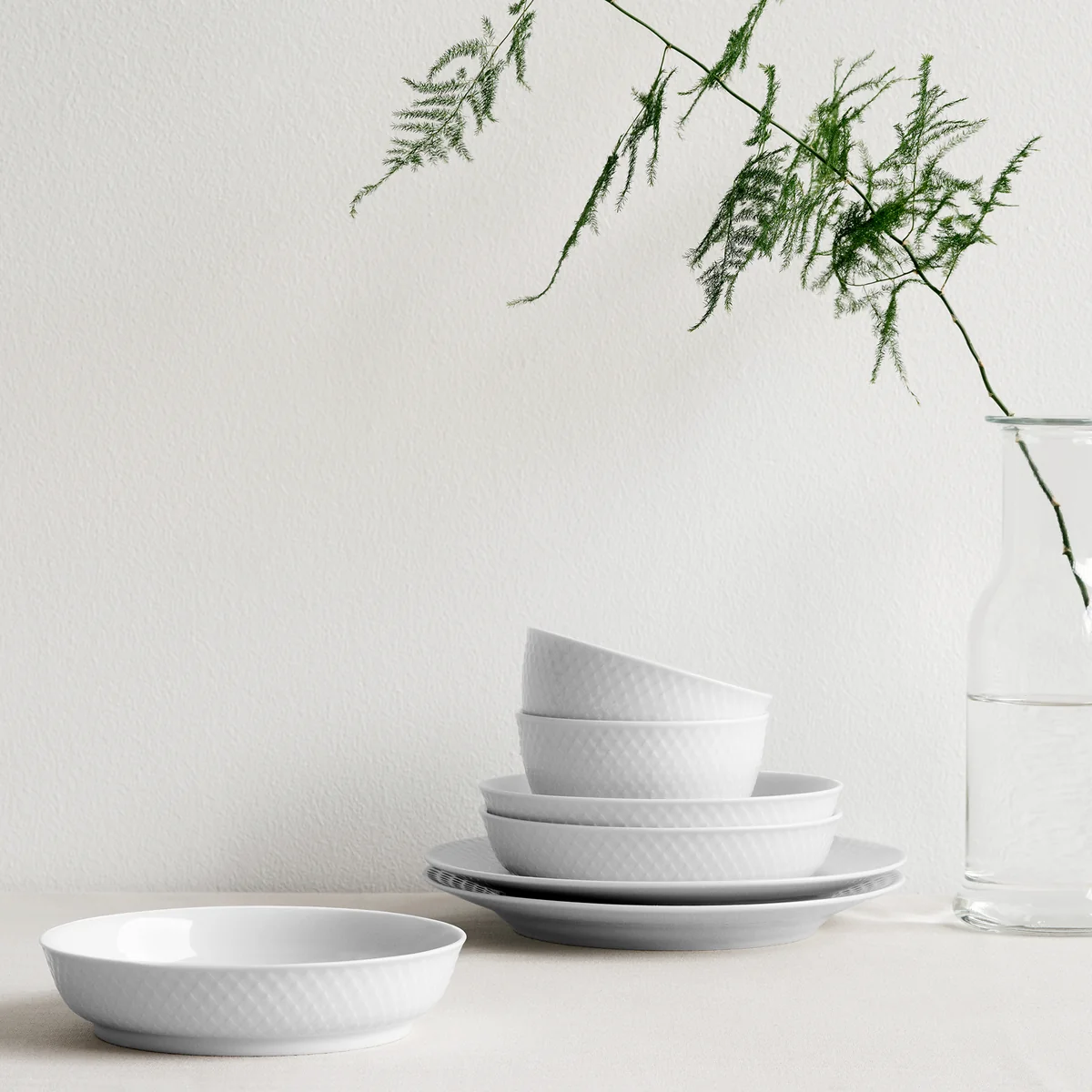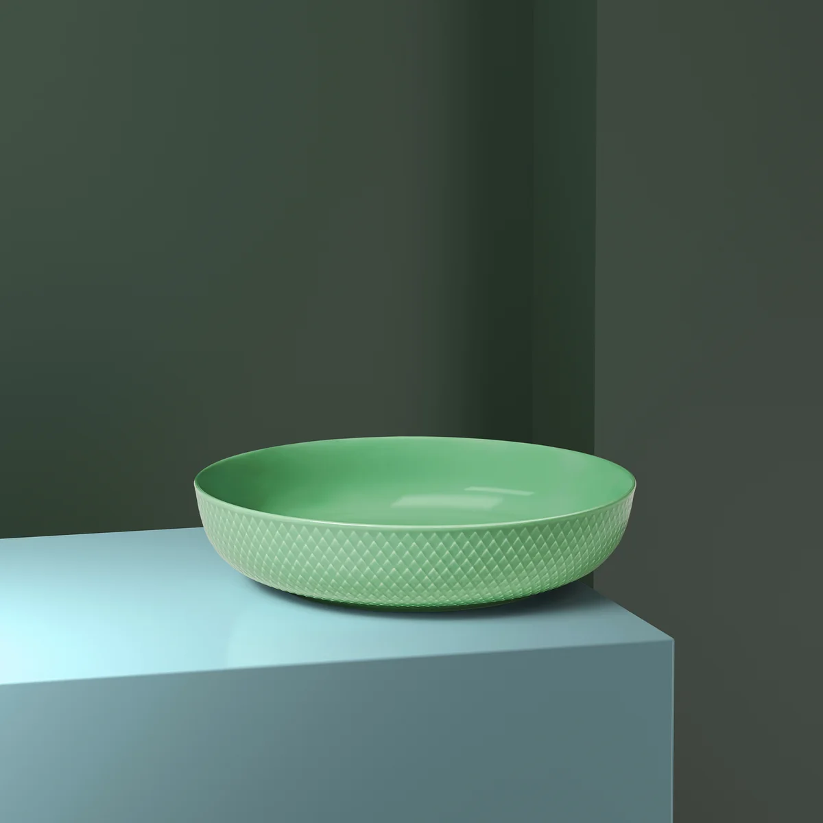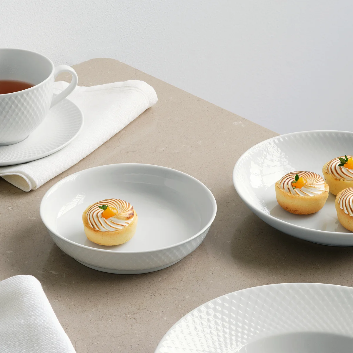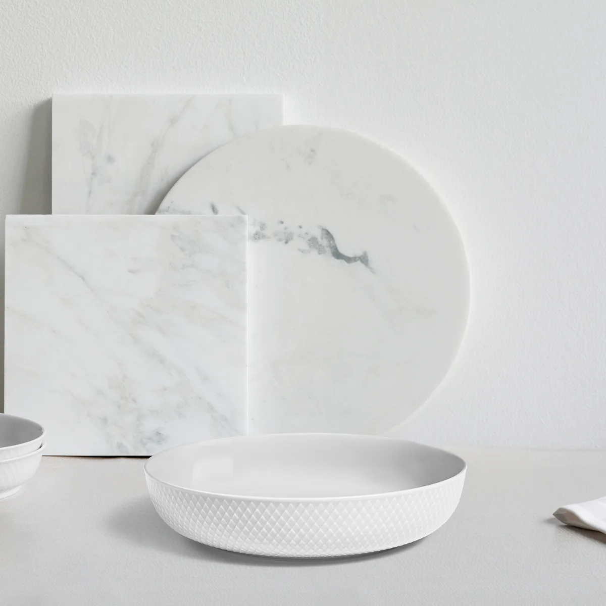 Die Rhombe Schale ist Teil der gleichnamigen Serie von Lyngby Porcelæn und zeichnet sich durch ihr filigranes Rauten-Muster auf dem Porzellan aus. Ursprünglich stammt das Muster von der 1961 entworfenen Danild Serie. Damals noch als Decal (Aufdruck) auf das Porzellan gebracht, ist das Dekor der Schale heute als Relief auf der Oberfläche eingeprägt. Bis heute hat das Muster nichts von seinem Charme verloren und integriert sich hervorragend auf klassisch sowie modern gedeckten Tischen.