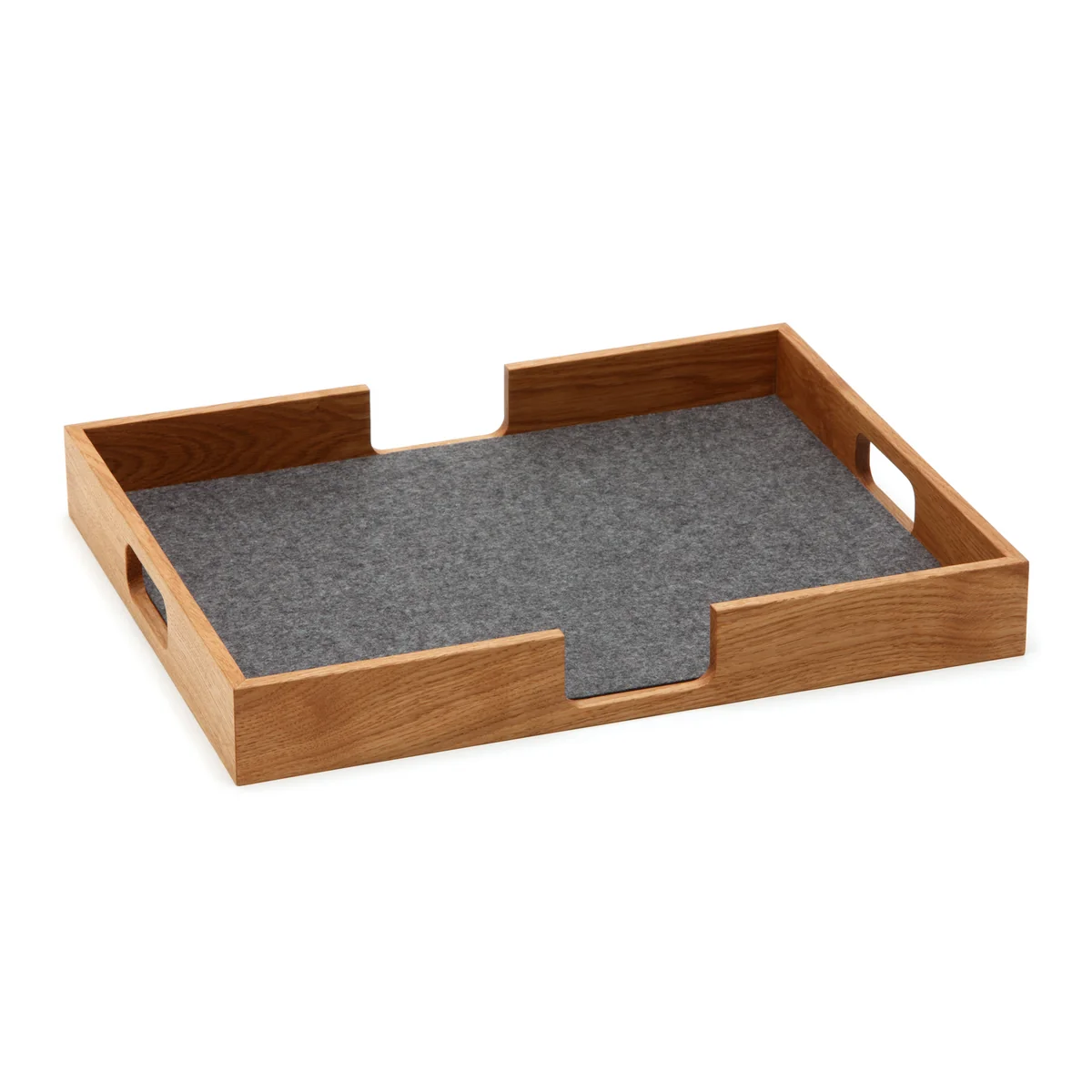 Das rechteckige Tray - Tablett von Hey Sign begeistert mit einem Materialmix aus gewachstem Eichen-Holz und weichem Filz. Das Holztablett mit praktischen Griffen zum Servieren und Dekorieren.