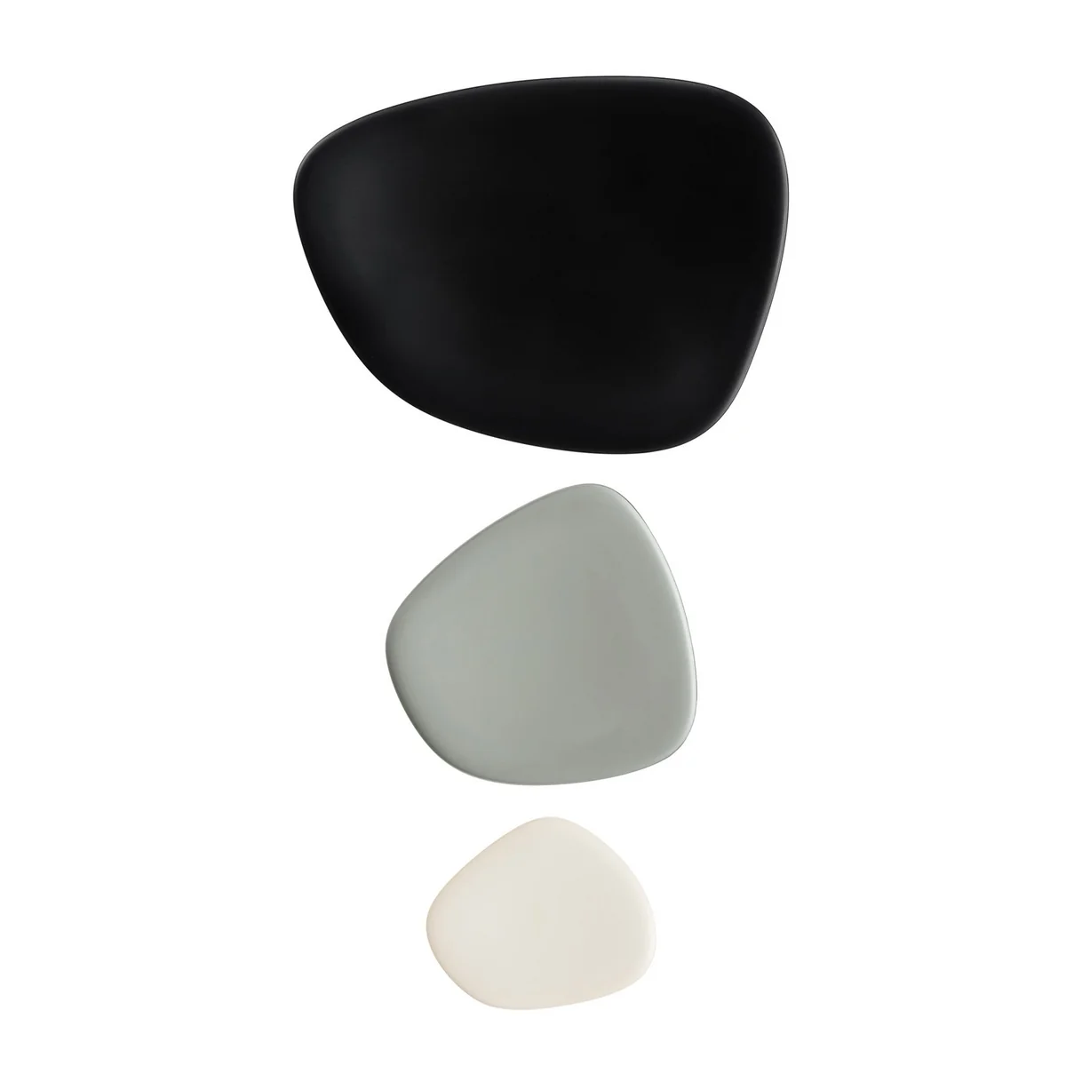Das Set, bestehend aus drei Tabletts aus Melamin ist in verschiedenen Grössen und Farben erhältlich. Die Teller sind entweder Ton in Ton (schwarz und orange) oder aber in pastelligen Kontrasten (schwarz, grau taupe) erhältlich.