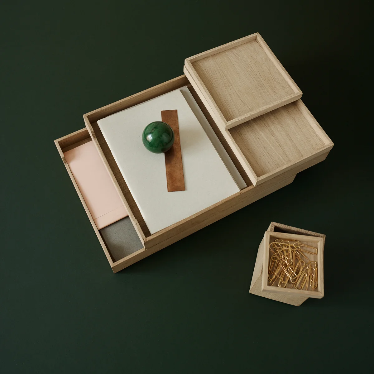 Das Designerteam von VE2 hat für den dänischen Hersteller Skagerak eine hochwertige Schreibtischausstattung aus Eichenholz entworfen. In unterschiedlichen Grössen lassen sich die Nomad Trays individuell kombinieren und stapeln - eine elegante Aufbewahrungsmöglichkeit für Scheren, Stifte, Brieföffner und andere Kleinigkeiten.