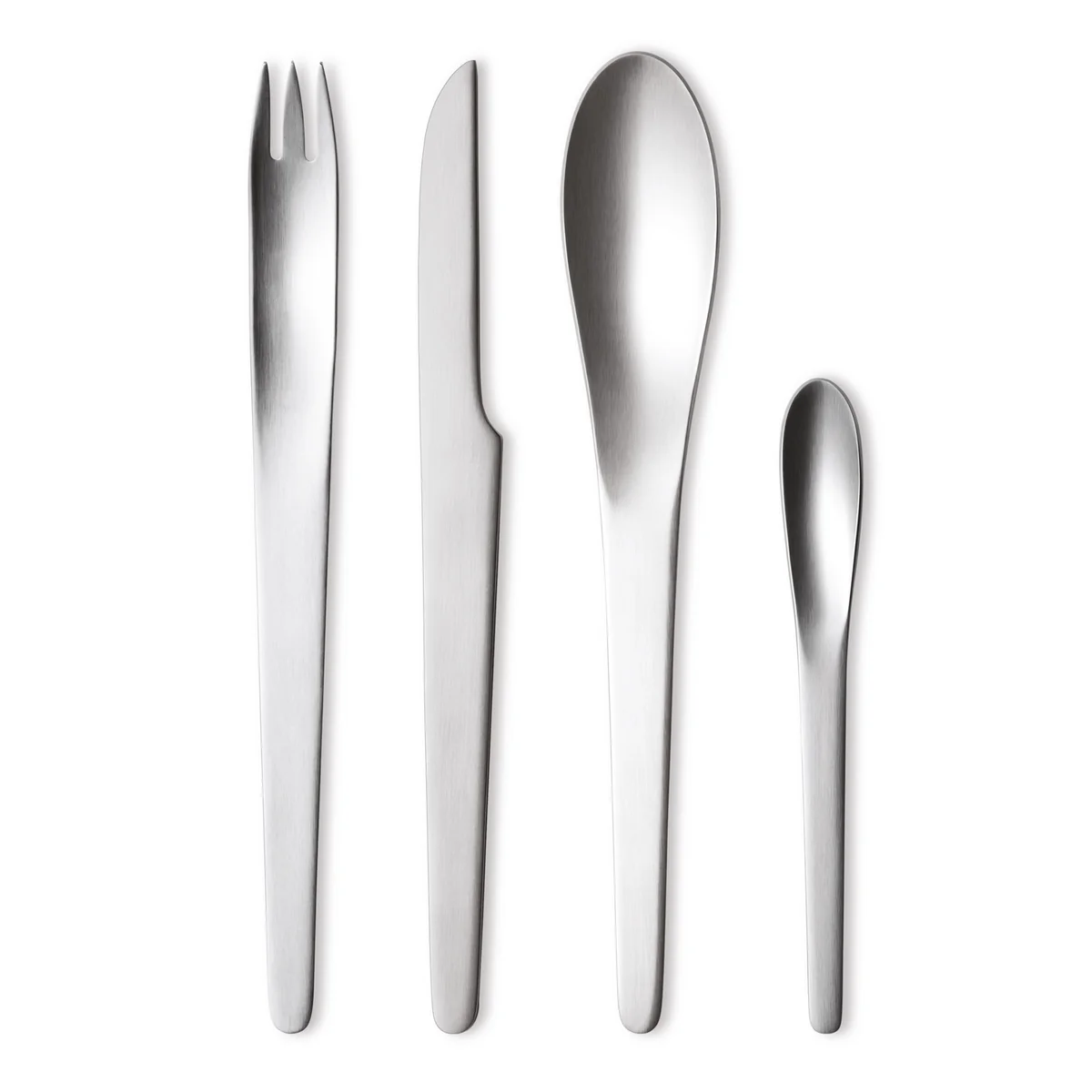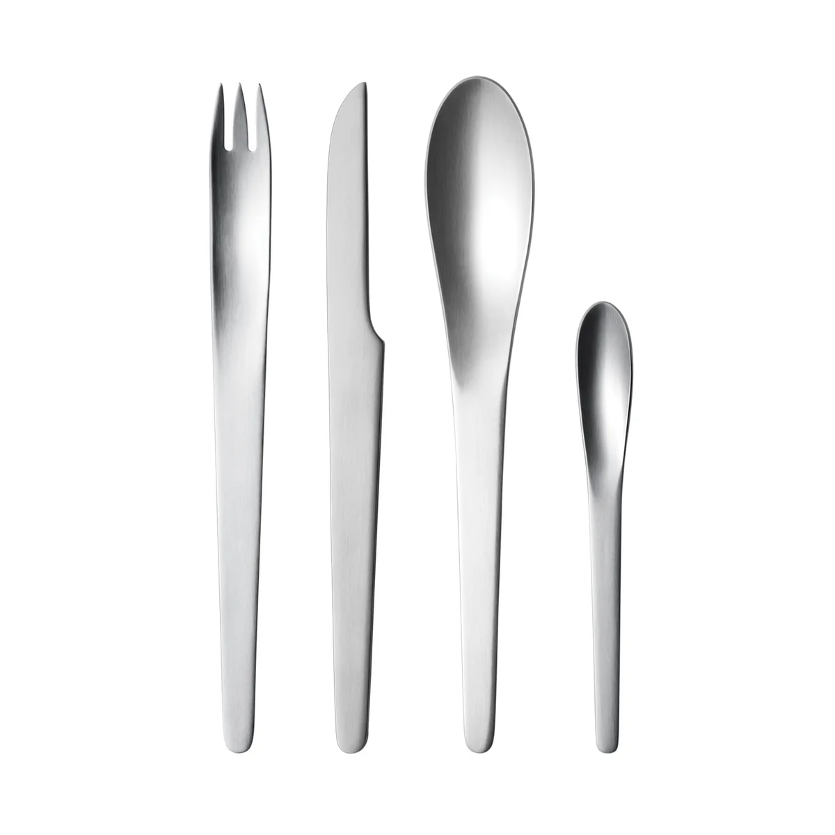 Die schlanke Form und die knappe Kontur von Arne Jacobsen hat das AJ Besteckset zum Klassiker gemacht. Es hat sich im Laufe der Zeit zu einem der bekanntesten Bestecke Georg Jensens entwickelt. Das Arne Jacobsen Besteck wird voin Georg Jensen aus mattem, rostfreiem Stahl gefertigt.