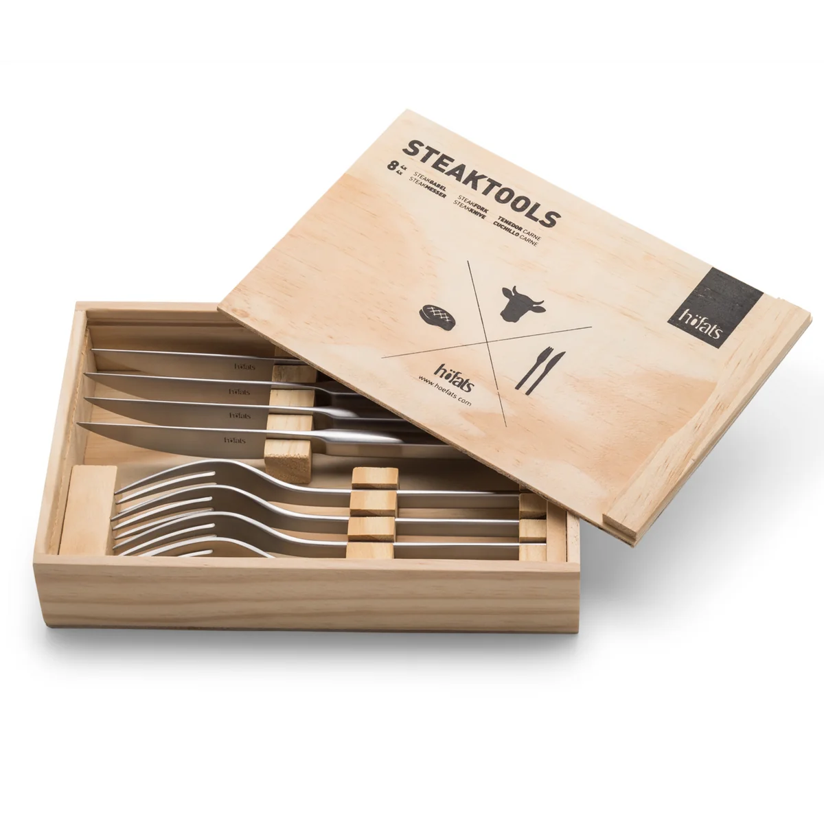 Geliefert wird das Steakbesteck in einer stilvollen Holzbox, die auch offen im Küchenregal platziert eine gute Figur macht und sich perfekt zum Schenken eignet.