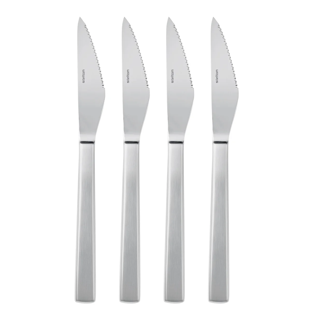 Das Maya Steakmesser des Labels Stelton ist die perfekte Ergänzung für das heimische Tafelbesteck. Das Steakmesser hat - wie auch der Rest der Maya-Serie des Designers Tias Eckhoff - eine charakteristische Dreiecksform. Das Messer liegt überaus angenehm in der Hand und wirkt optisch zudem äusserst zeitlos und ansprechend. Der scharfe Wellenschliff des Steakmessers ermöglicht das Schneiden von gegrilltem Fleisch oder Gemüse. Besonders in Kombination mit weiteren Teilen der Maya-Serie entsteht ein einheitliches Bild. Das Steakmesser ist im 4er-Set erhältlich.