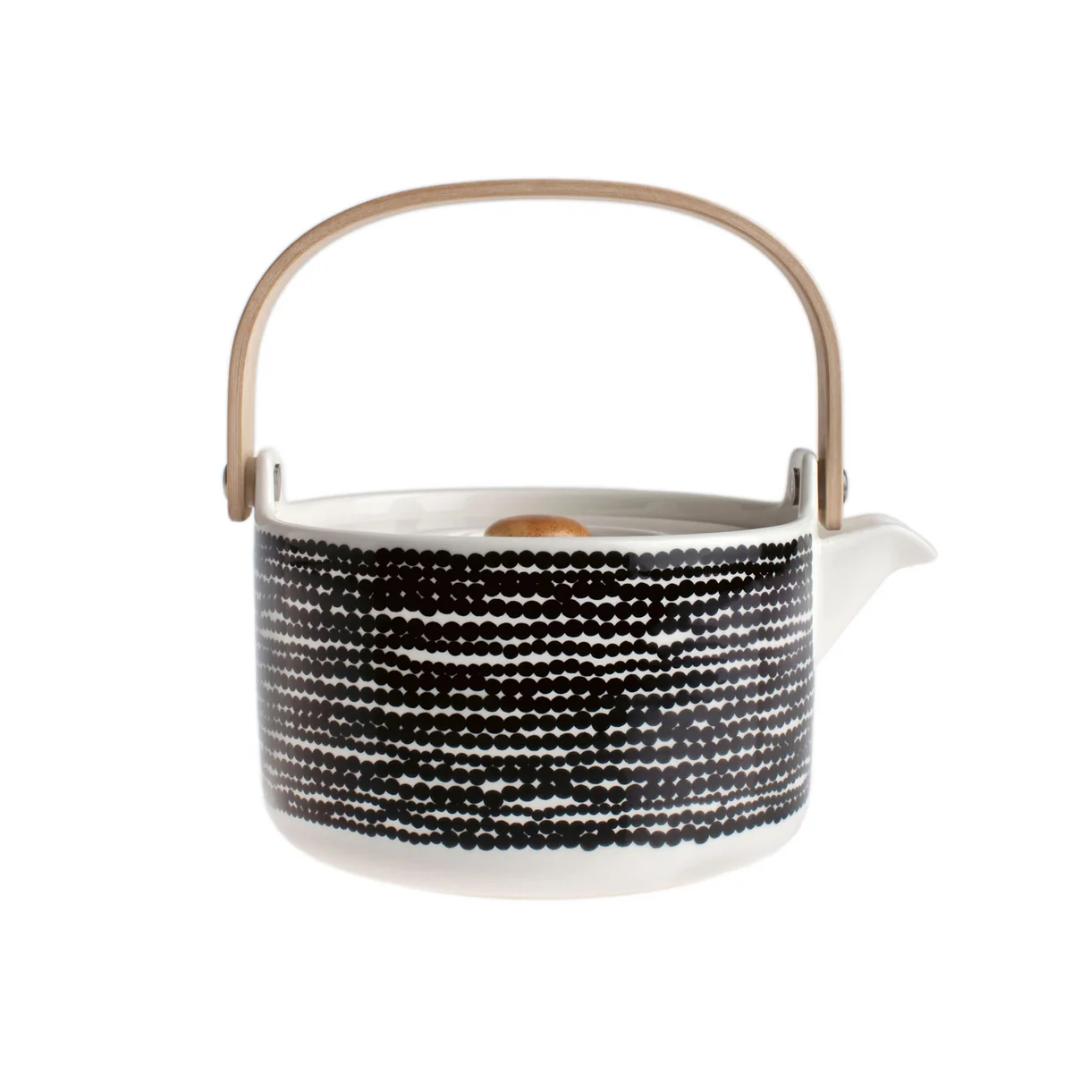 Marimekko fertigt die Oiva Räsymatto Teekanne aus Steinzeug. Der Deckel sowie der Henkel bestehen aus Holz und das Teesieb aus Keramik.