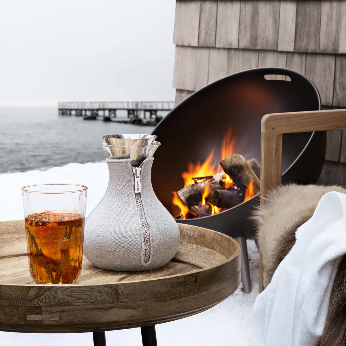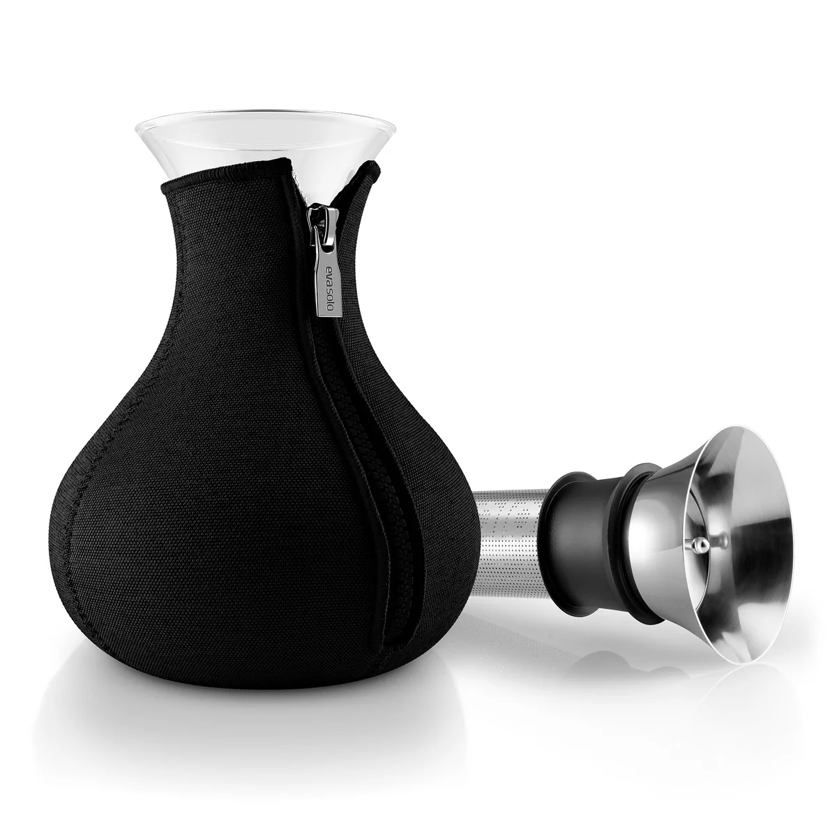 Der Teezubereiter von Eva Solo, entworfen von Claus Jensen und Hendrik Holbæk von Tools Design, verfügt über zwei Brühmöglichkeiten und eignet sich daher für alle Arten von Tee, wobei Teesorten ohne Gerbsäure, z.B. Kräutertee, direkt in die Teekanne gegeben werden können. Setzt man danach den Filter ein, verbleiben die Blätter beim Eingiessen in der Kanne.
