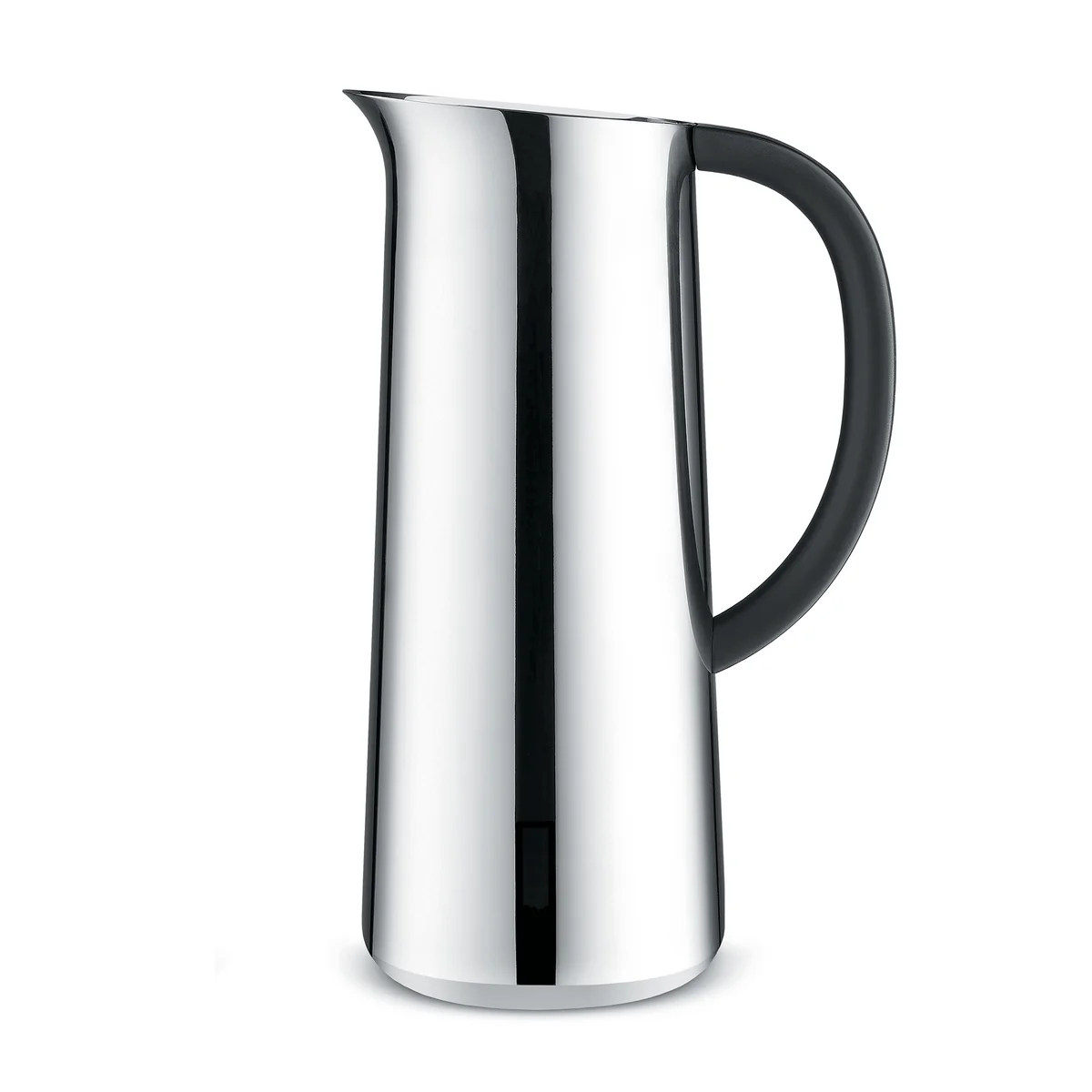Die Nomu Isolierkanne von Naoto Fukasawa für Alessi ist eine Edelstahlkanne zum Servieren von Kalt- und Heissgetränken. Anstatt eines Deckels besitzt die Kanne einen Ausguss und einen schwarzen Henkel. Auf der Arbeit oder zuhause auf dem Esstisch glänzt die Isolierkanne mit ihrem edlen, aber dennoch schlichten Design.