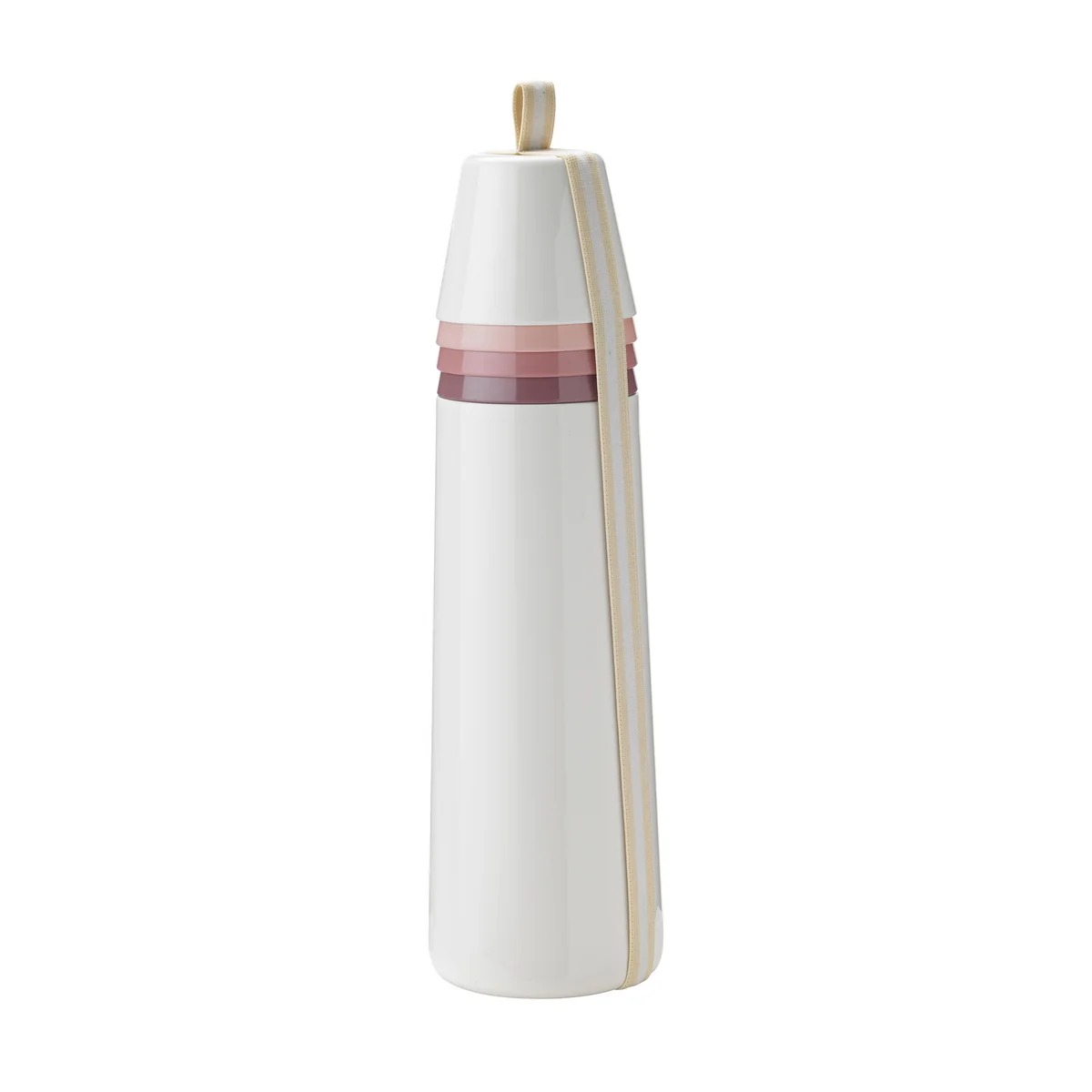 Die Isolierflasche wird mit 4 Bechern in verschiedenen Farben geliefert. Die Becher sind aus stabilem PBT-Kunststoff hergestellt. Ideal für Familien mit kleinen Kindern. Die Isolierflasche ist mit einem Gummiband versehen, das die Teile zusammenhält, wenn sie nicht benutzt werden oder im Auto oder im Fahrradkorb liegen.