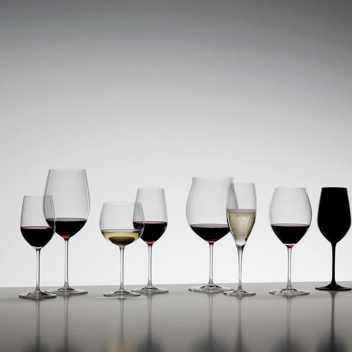 Neben den Weinkelchen für die verschiedenen Rot- und Weissweine wie Chablis, Riesling, Reserva, Burgunder und Bordeaux und viele mehr umfasst die Serie Gläser für Schaumwein, Wasser, Grappa, Sherry und Tequila, Champagner, Cognac, Steinfrucht, Kernobst, Whisky und Martini. Ein besonderer Hingucker ist das gänzlich mit Kobalt und Mangan schwarz eingefärbte Blind Tasting Glas. Die Farbe des Weines kann durch das blickdichte Glas nicht wahrgenommen werden und der Weintester kann sich voll und ganz auf Aroma und Geschmack des Weins konzentrieren.