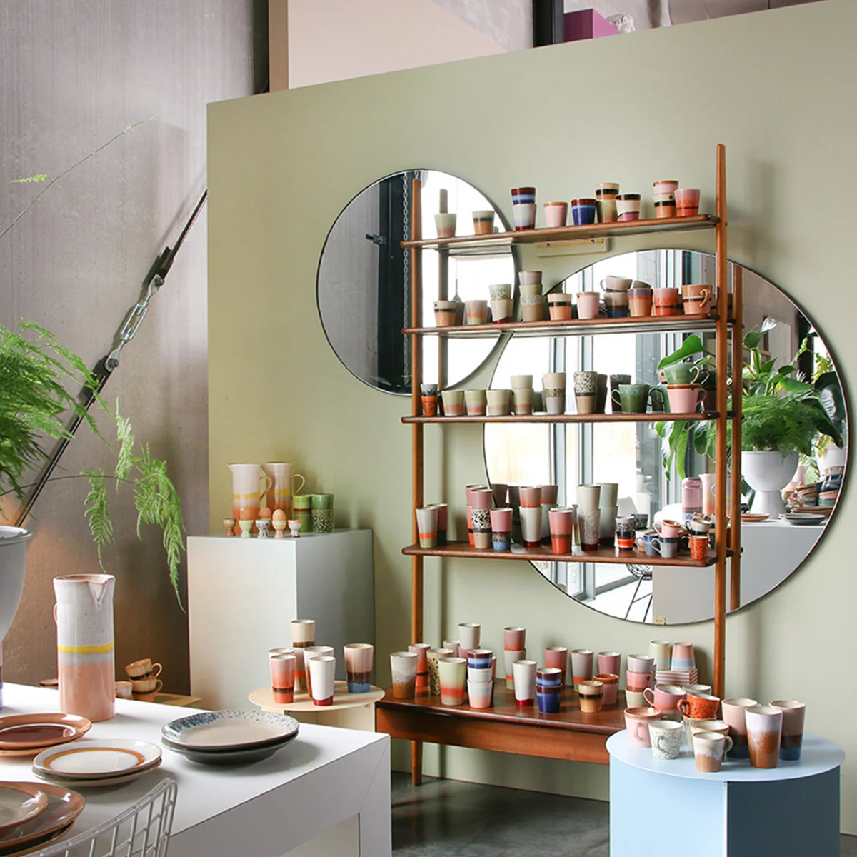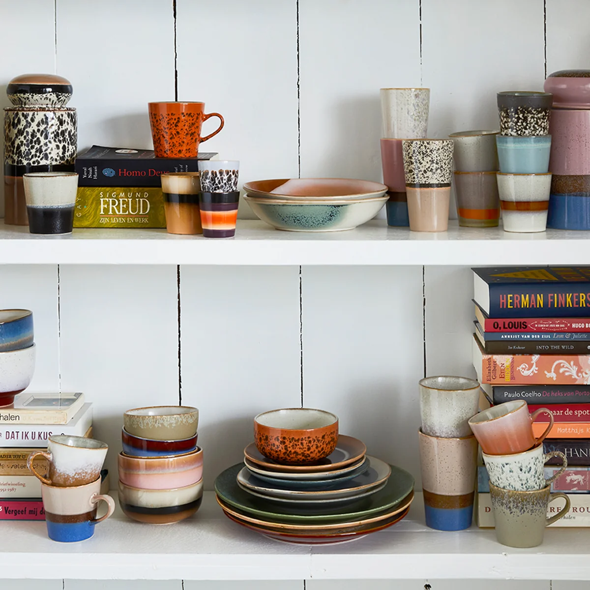 So wie es sich für ein Sammlerstück gehört, sind die HKliving Tassen und Becher in einer Vielzahl verschiedener Varianten erhältlich: Als Kaffee- und Latte-Macchiato-Becher, Cappuccino-Tasse mit Henkel, Espresso- sowie Americano-Tasse. Alle Varianten haben den typisch flippigen 70er-Jahre-Stil gemein, der für einen Hauch Nostalgie bei Betrachtern und Verwendern sorgt. Der niederländische Hersteller bietet ausserdem Schalen, Teller und Karaffen im selben Design an.
