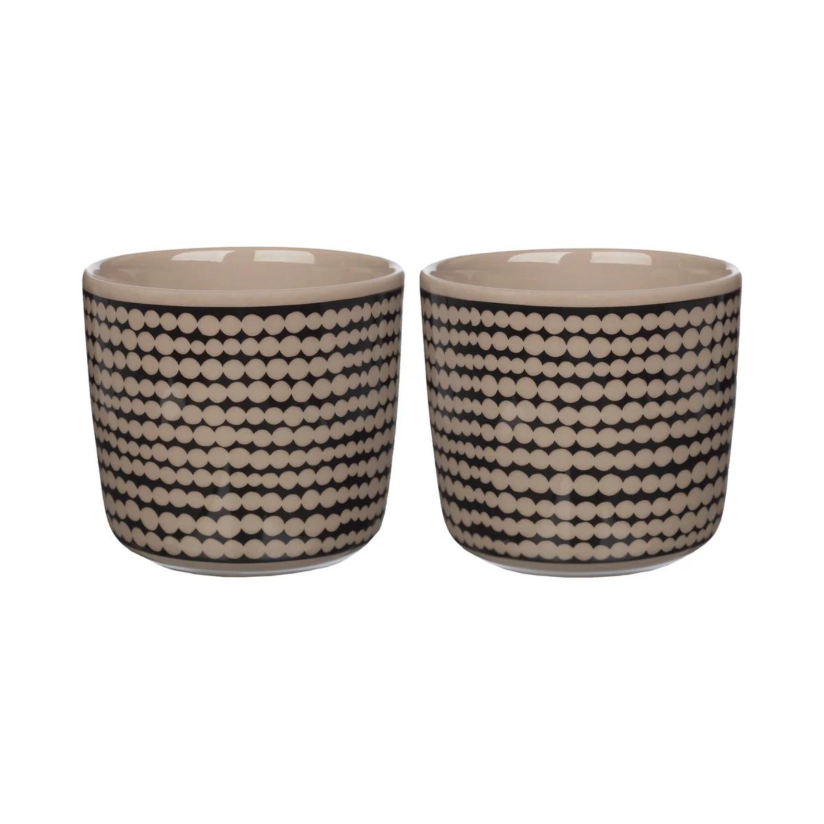 Das Oiva Siirtolapuutarha Set von Marimekko besteht aus zwei Bechern ohne Henkel. Die Becher sind mit dem Räsymatto-Muster verziert und bestehen aus spülmaschinengeeignetem, backofen-, mikrowellen- und gefriertresistentem Steinzeug.