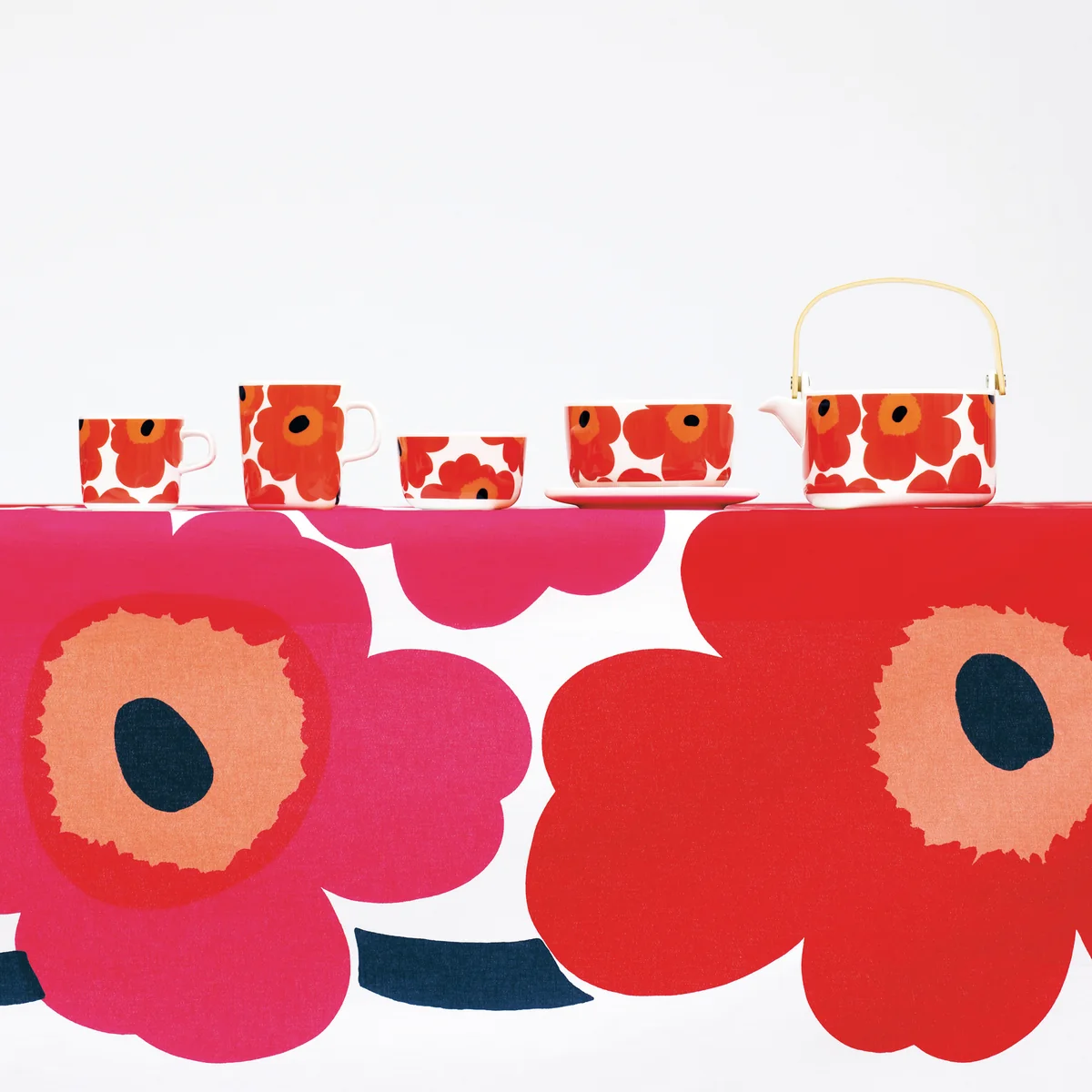 Seit 1964 hat das Muster von Maija Isola einen Siegeszug durch alle Bereiche gefeiert: Das ausdrucksstarke Design aus Finnland ziert längst nicht mehr nur Textilien. Auch Marimekko Tassen und viele weitere Accessoires profitieren von den leuchtenden Farben und schwungvollen Formen des Unikko Motivs - so auch der Unikko Becher mit Henkel.