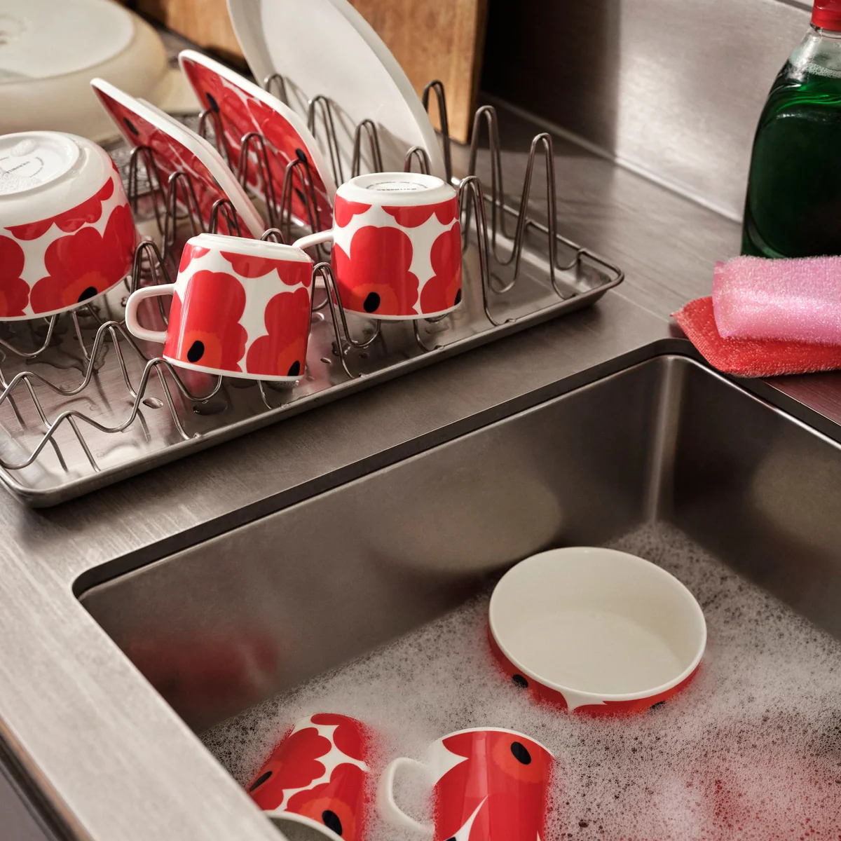 Die Marimekko Tasse gehört zur Geschirrserie Oiva. Die einfachen Linien der Serie setzen das Blumenmuster in den Fokus. Mit 200 ml, 250 ml oder 400 ml passt ein grosser Kaffee, aber natürlich auch ein Tee oder jedes andere Getränk in die Marimekko Tasse Unikko der Serie Oiva. Der finnische Hersteller fertigt die Design-Tasse aus Steinzeug.