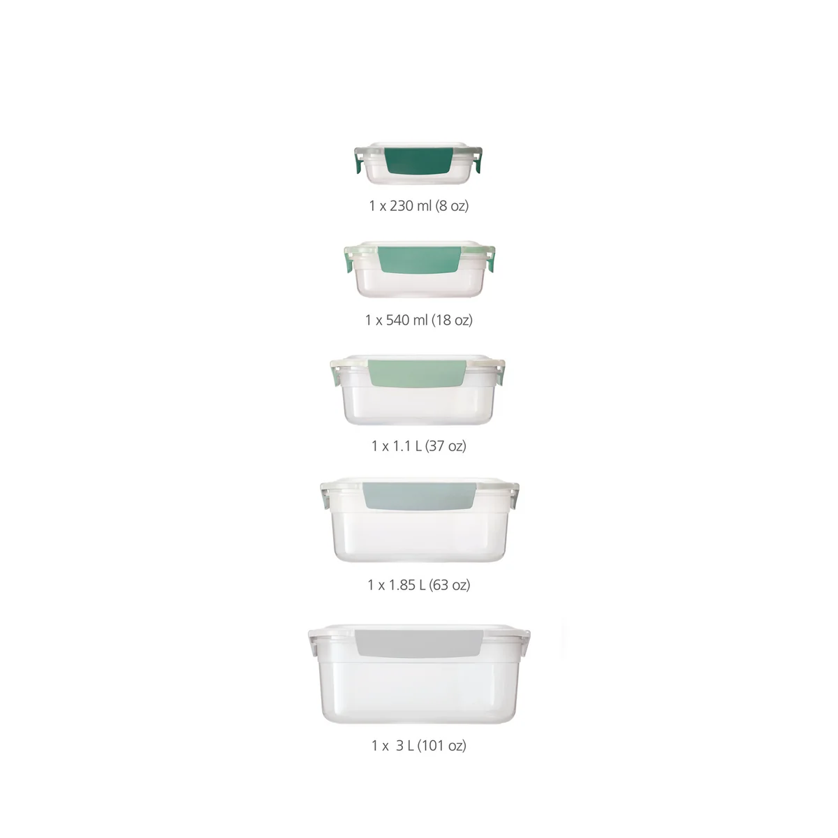 | Details | Im Set enthalten: 1x 230 ml, 1x 540 ml, 1x 1,1 l, 1x 1,85 l, 1x 3 l. |